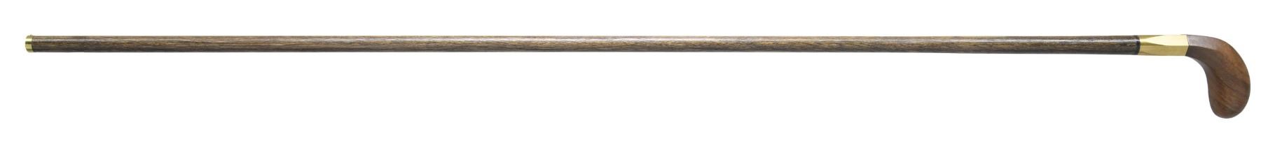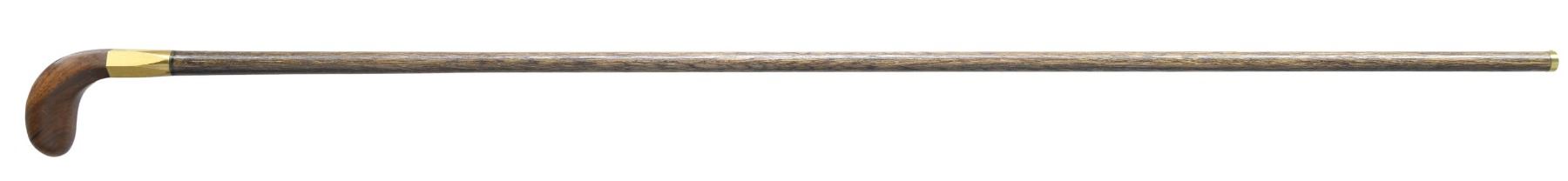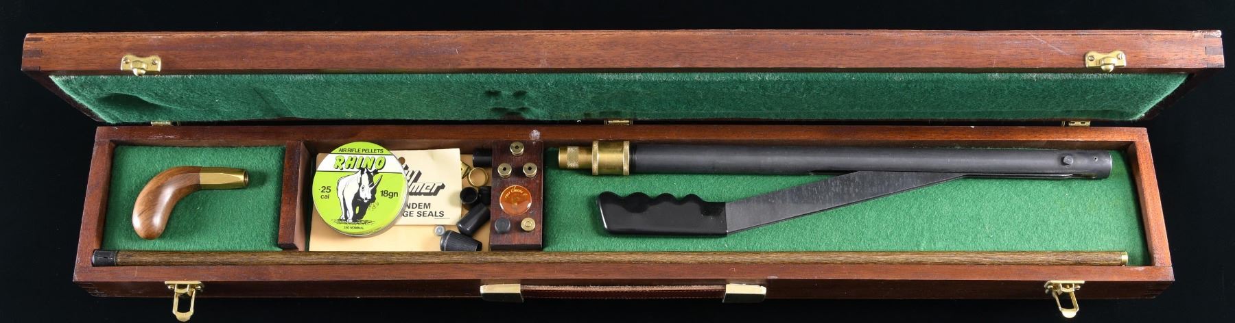 CAL. 25. NSN. Mfg. in 1980's & sold by Beeman in the US as a repro of 19th Century Walking Cane Gun. Utilizes a gas cartridge in 32" barrel with veneer sleeve. Screw on walnut head with brass fitting. UNATTACHED ACCESSORIES: walnut case containing Pneumatic lever to charge cases, can of Rhino 25 cal. pellets, cartridge seals, instructions & copy of Guns & Ammo 1988 article on Harper air gun. CONDITION: all aspects appear near excellent. (02-23922/MD). $500-800.