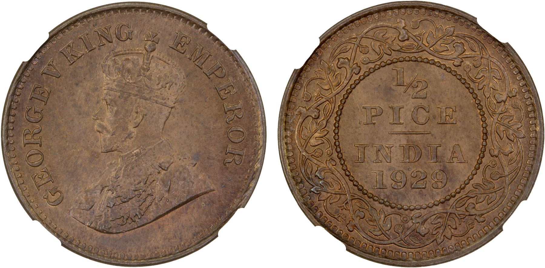 BRITISH INDIA: George V, 1910-1936, AE 1/2 pice, 1929(c), KM-510, a wonderful quality example for type! NGC graded MS65 RB. CAC.
