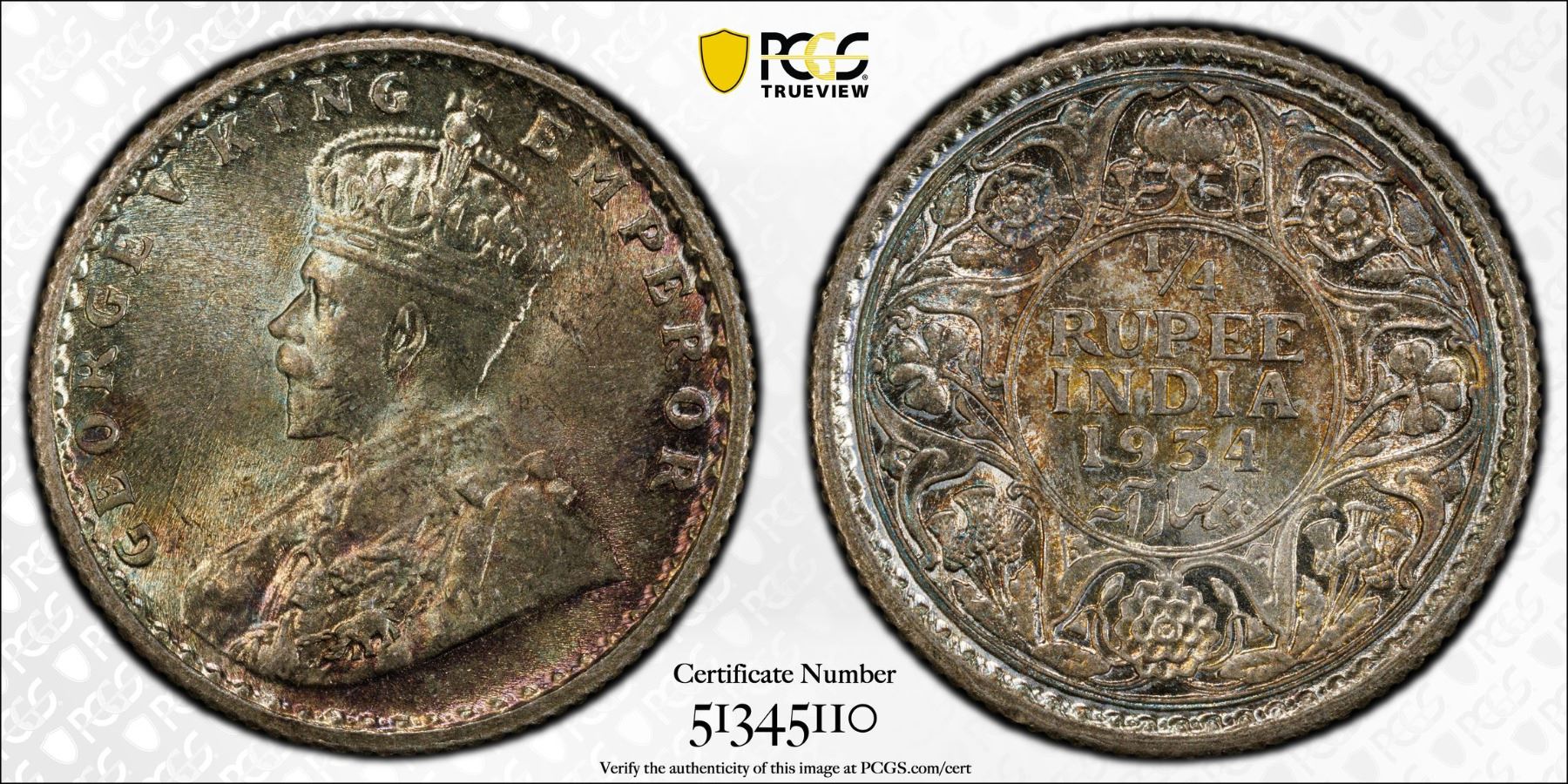 BRITISH INDIA: George V, 1910-1936, AR 1/4 rupee, 1934(c), KM-518, S&W-8.172, a superb lustrous mint state example! PCGS graded MS65.