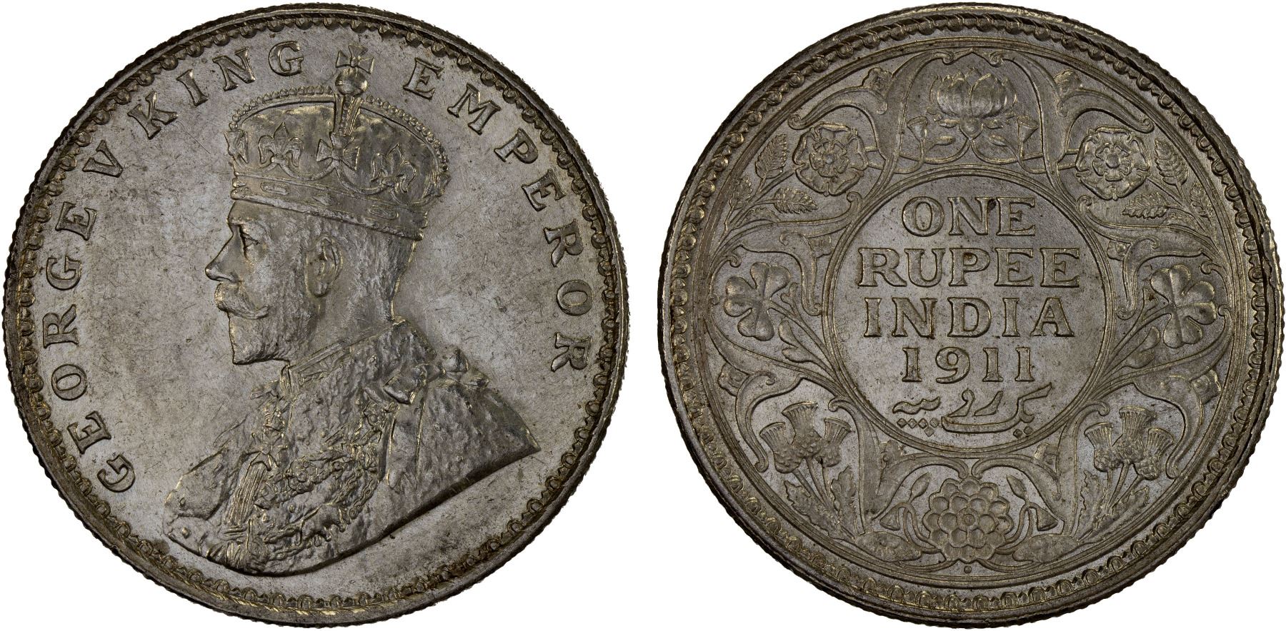 BRITISH INDIA: George V, 1910-1936, AR rupee, 1911(b), KM-523, so-called "pig"-style elephant, one-year type, faint surface hairlines, lustrous fields, Unc. The 1911 accession to the throne of Emperor George V led to the famous "pig rupee." On the coin, the King appears wearing the chain of the Most Eminent Order of the Indian Empire. Because of poor engraving, the elephant looked very much like a pig. The Muslim population was enraged and the image had to be quickly redesigned.