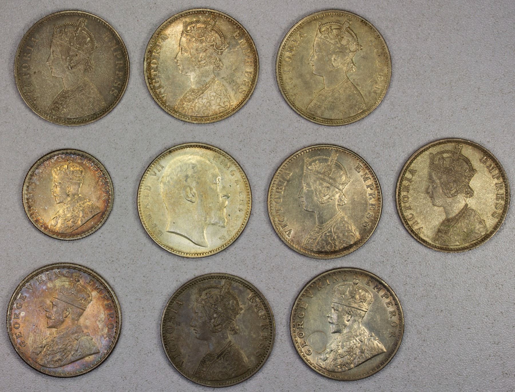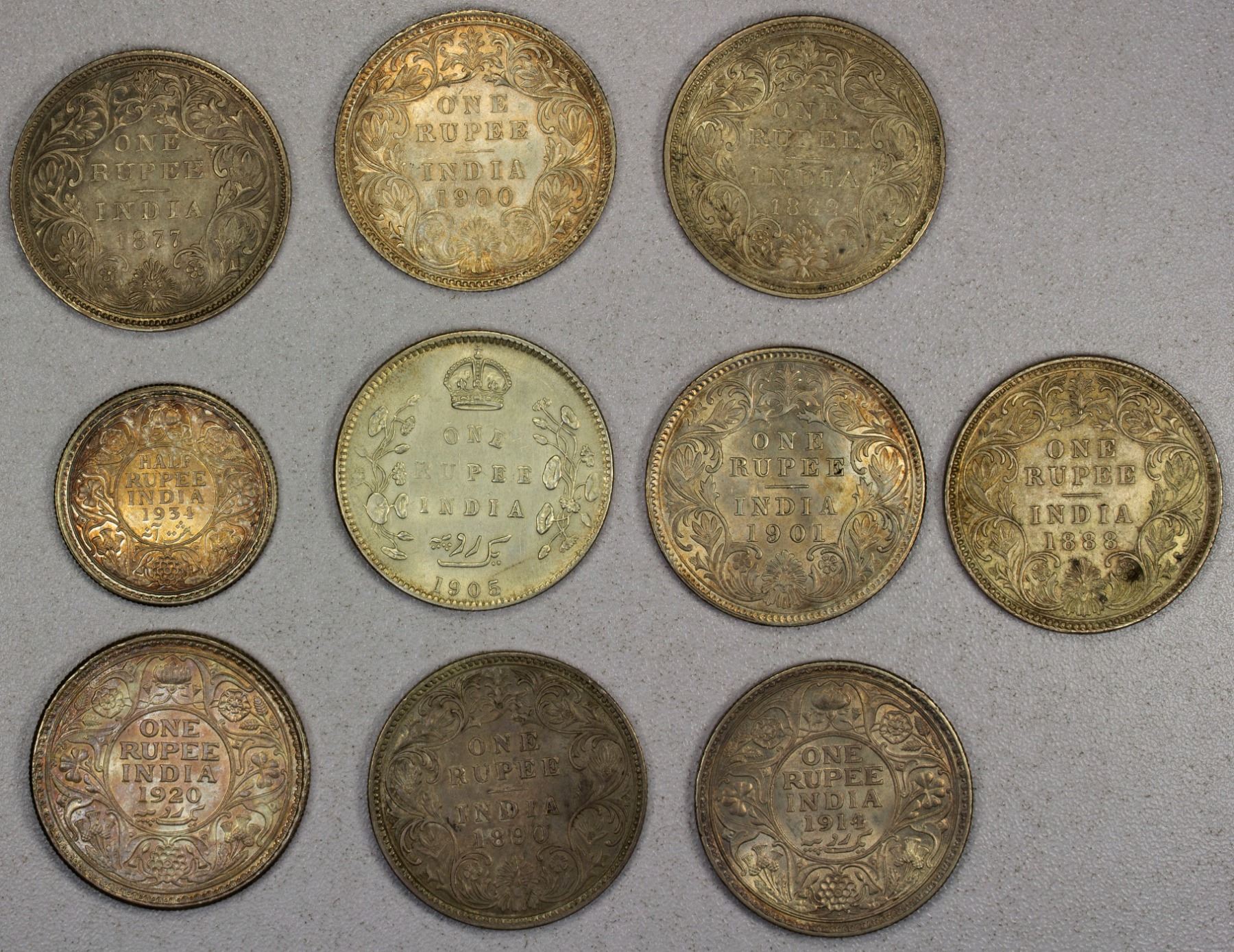 BRITISH INDIA: LOT of 10 coins, an attractive lot of silver coins including; 1/2 rupee 1934(c), 1 rupee, 1862, 1877 with dot, 1888-B raised, 1890-B incuse, 1900-B incuse, 1901-C incuse, 1905(c), 1914(b), 1920(c), mostly better quality than normally encountered, retail value $450, lot of 10 coins.