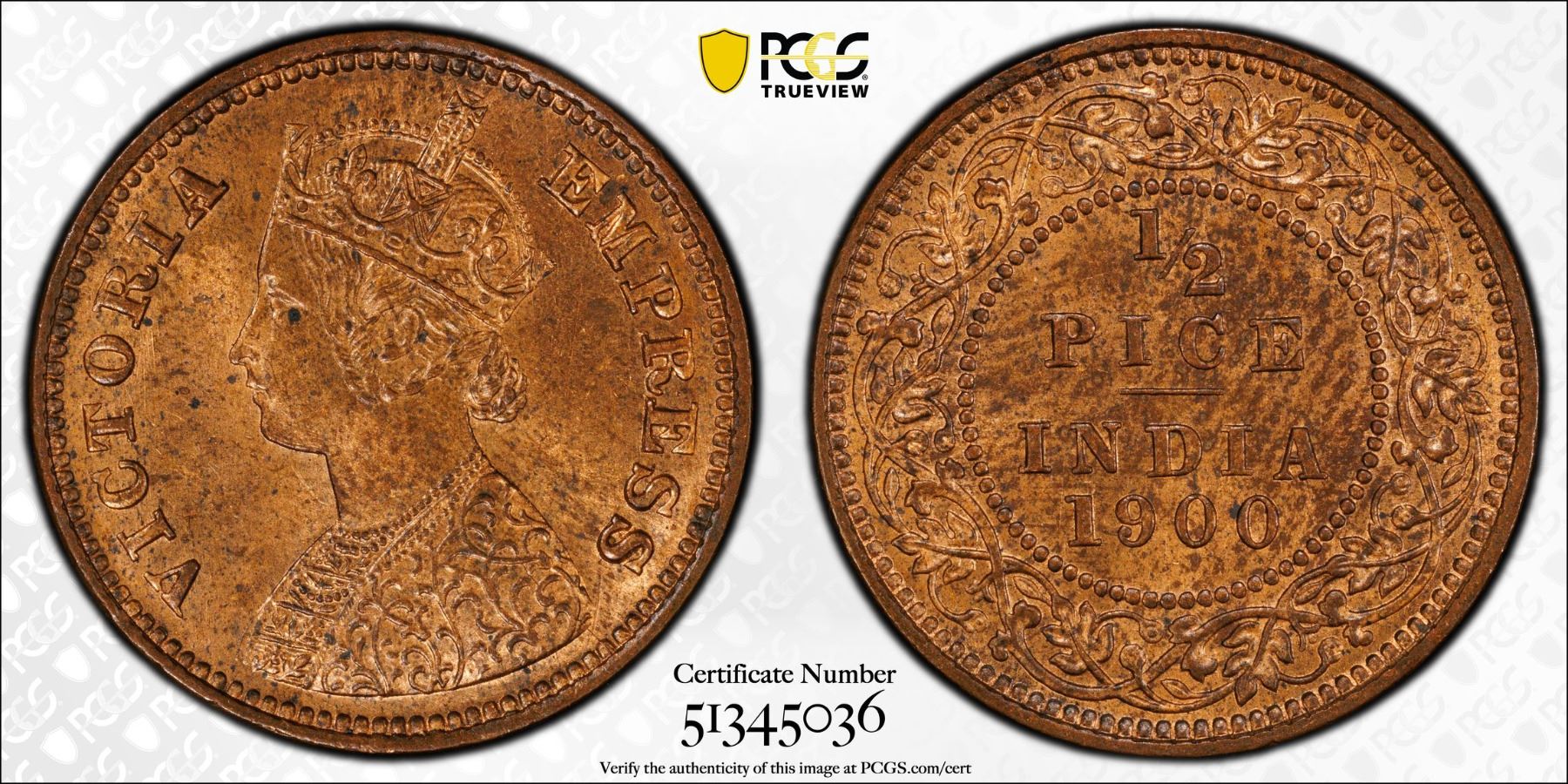 BRITISH INDIA: Victoria, Empress, 1876-1901, AE 1/2 pice, 1900(c), PCGS MS63 RB