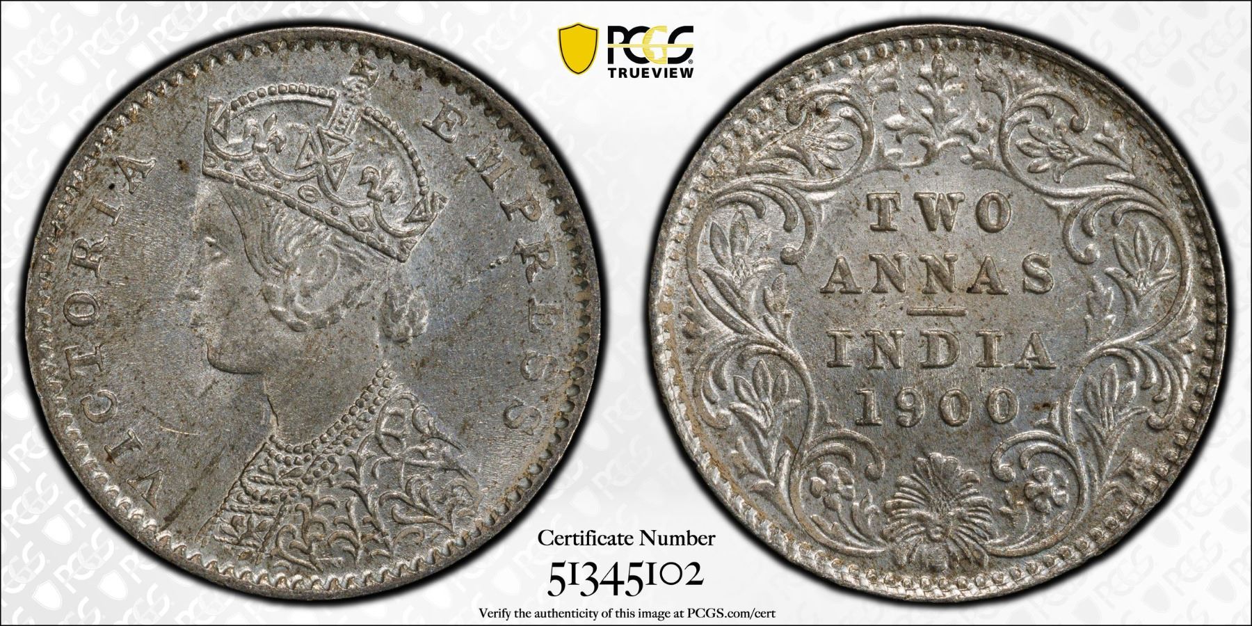 BRITISH INDIA: Victoria, Empress, 1876-1901, AR 2 annas, 1900-C, PCGS MS64