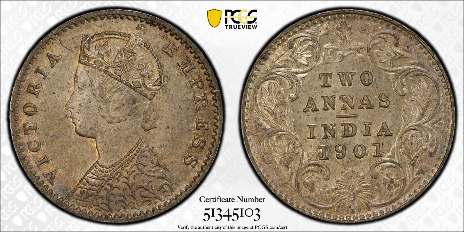BRITISH INDIA: Victoria, Empress, 1876-1901, AR 2 annas, 1901-C, PCGS MS64