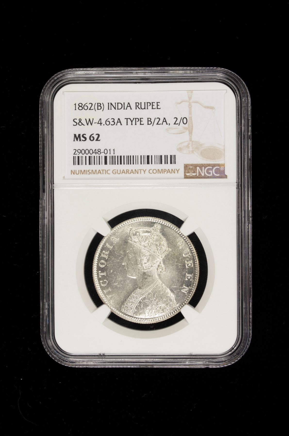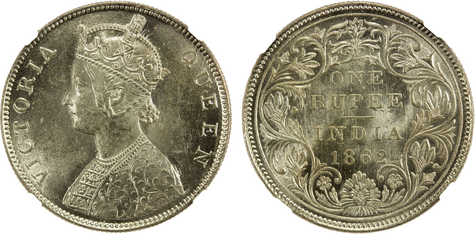 BRITISH INDIA: Victoria, Queen, 1837-1876, AR rupee, 1862(b), NGC MS62