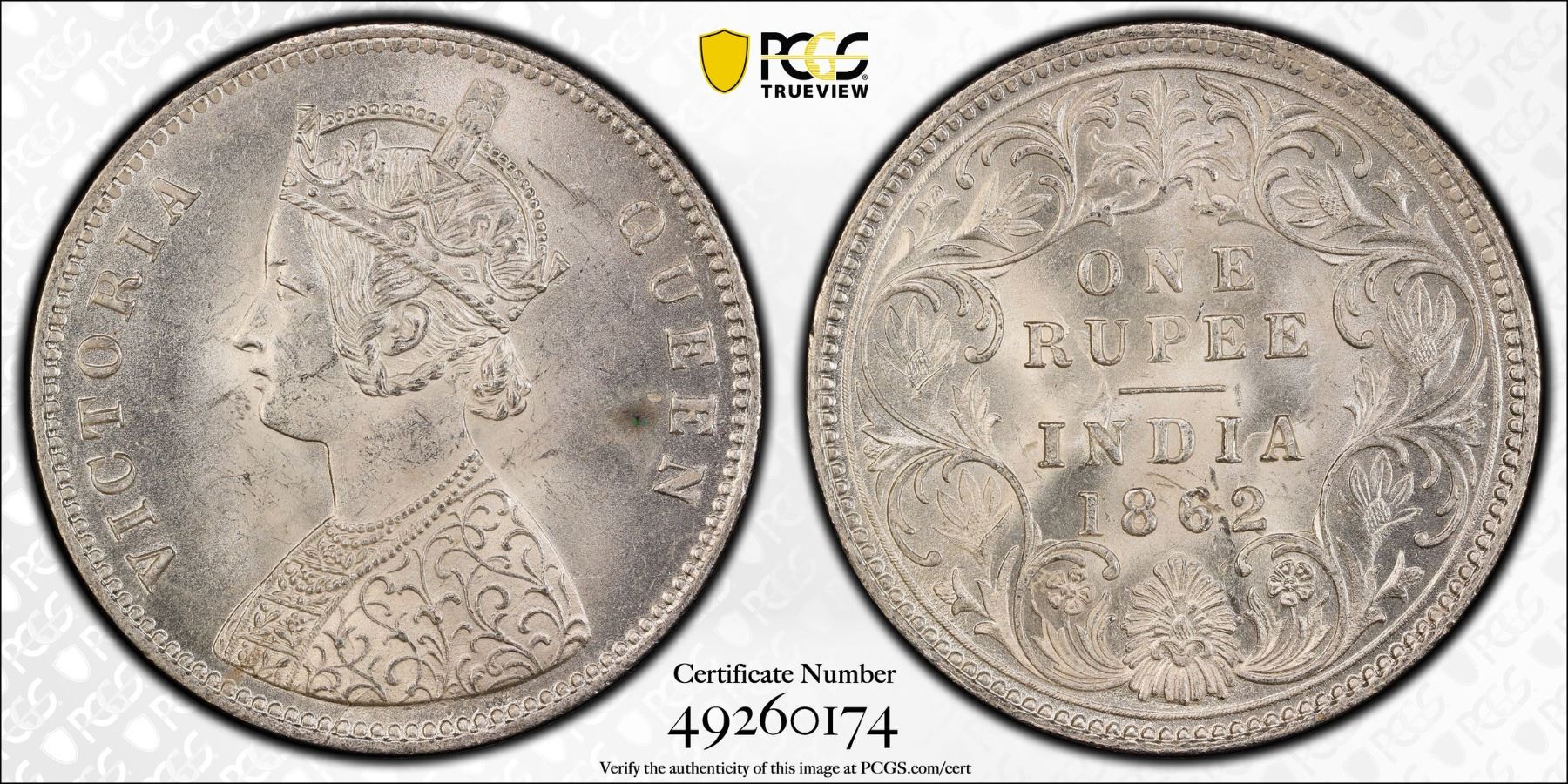 BRITISH INDIA: Victoria, Queen, 1837-1876, AR rupee, 1862(c), PCGS graded MS63