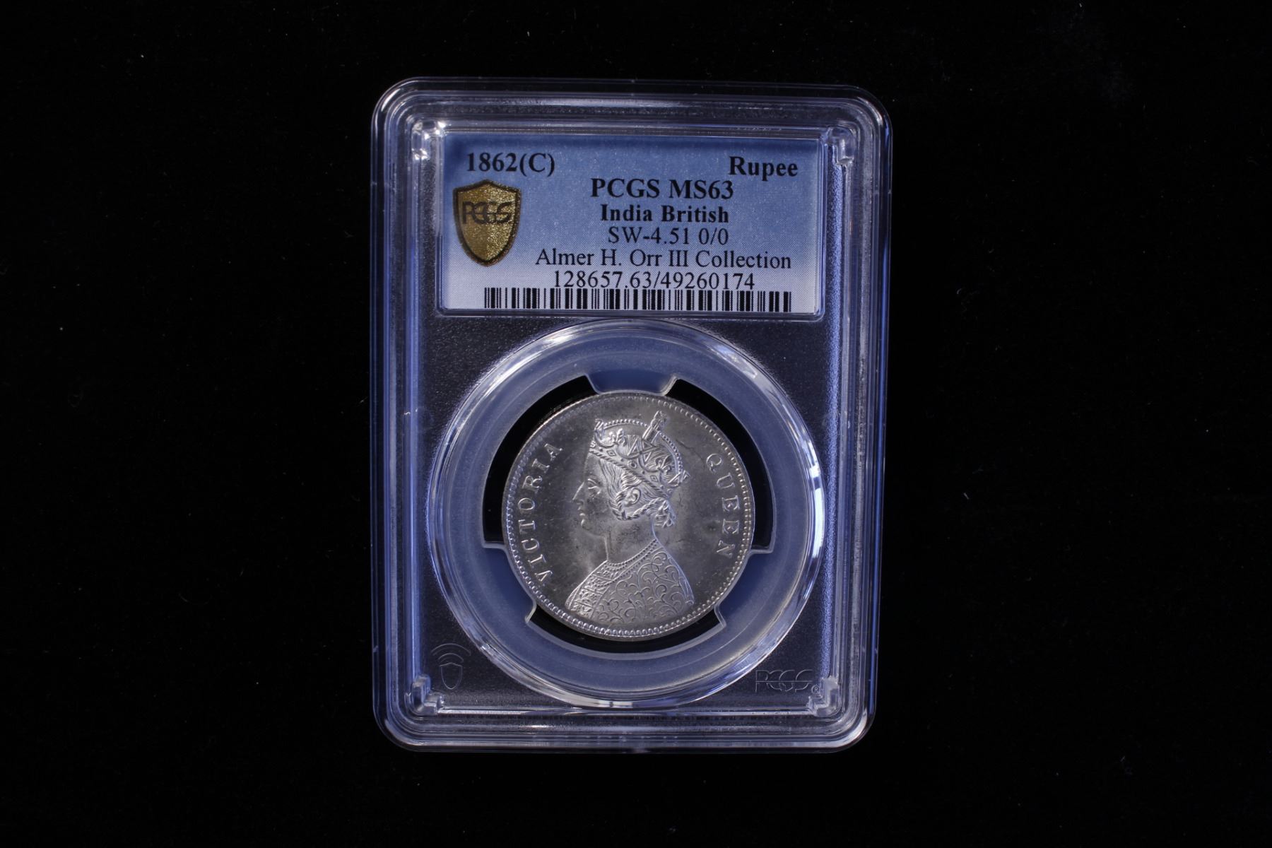 BRITISH INDIA: Victoria, Queen, 1837-1876, AR rupee, 1862(c), KM-473.1, S&W-4.51, Prid-66, 0/0, a lovely lustrous example! PCGS graded MS63, ex Almer H. Orr III Collection.
