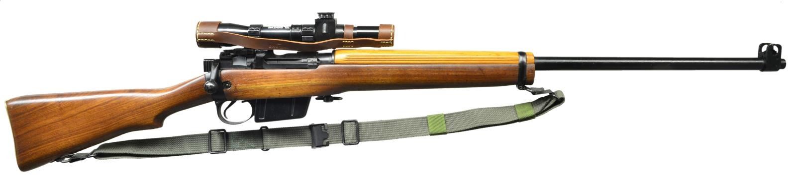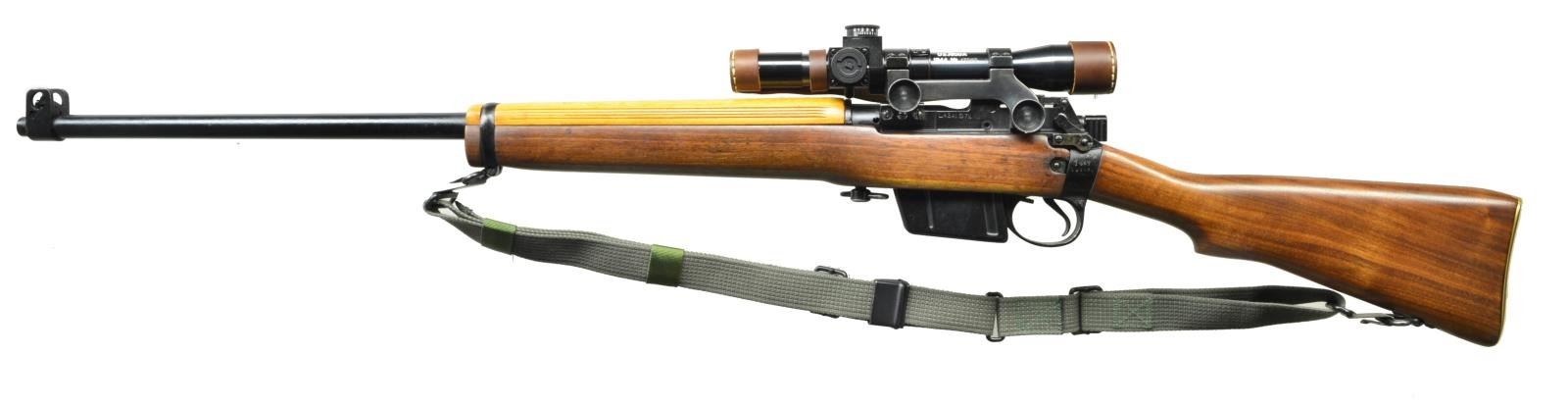 Cal. 7.62 NATO. S# AS3079. Bbl. 27 1/2". Left side of receiver is marked "L42A1", "D71 & "T". Left side of socket remains original No. 4 T sniper markings which read "M47C/1943/AS3079/TR". Bolt is matching but other parts appear unnumbered. Rifle has standard No. 4 ladder rear sight & blade front sight w/ protective ears. Rifle also has reproduction No. 32 MKII scope & unmarked mount. Scope has post reticle w/ very good optics. No. 4 buttstock w/out cheekpiece. L42A1 hardwood forend w/ beech handguard that is lighter in color. Bottom mounted sling swivels w/ additional front trigger guard swivel. Green canvas military style sling. MAGS: 1-10 rd. detachable marked "CR141A65D". UNATTACHED ACCESSORIES: reproduction lens covers. CONDITION: refinished stock set has added oil finish w/ some handling marks. Brass buttplate was polished & shows some light oxidation. Mount shows added touch up blue. Balance of metal retains 90% Suncorite finish w/ some scattered light flaking. Very good bore. (22-2450/MJC). CURIO. $1000-2000.