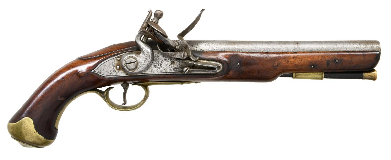 BY RICHARDS. Cal. 68 S# NSN. The 9-1/8" tapered round barrel with military turnings at breech is stamped with two military proofs. Slightly chamfered lock with serpentine cock, integral rounded pan, bridled friction frizzen and feather spring with dog nose finial is stamped with a crown at center, "RICHARDS" is behind cock. European walnut stock extends to muzzle and is pinned to barrel, there is a large beavertail around barrel tang. Pistol is brass mounted with standard grip cap, trigger guard with small husk finial and flat serpentine sideplate. Ebony ramrod with brass tip mounts through single beaded brass pipe. CONDITION: good, showing extensive cleaning and refinishing. Iron parts with pitted pewter gray appearance. Stock with oil refinish; details rounded. There are no regimental or storekeepers markings. Bore is pitted. Lock is operable. Touch hole enlarged. (01-24073/MGM). ANTIQUE. $2,000-3,000.