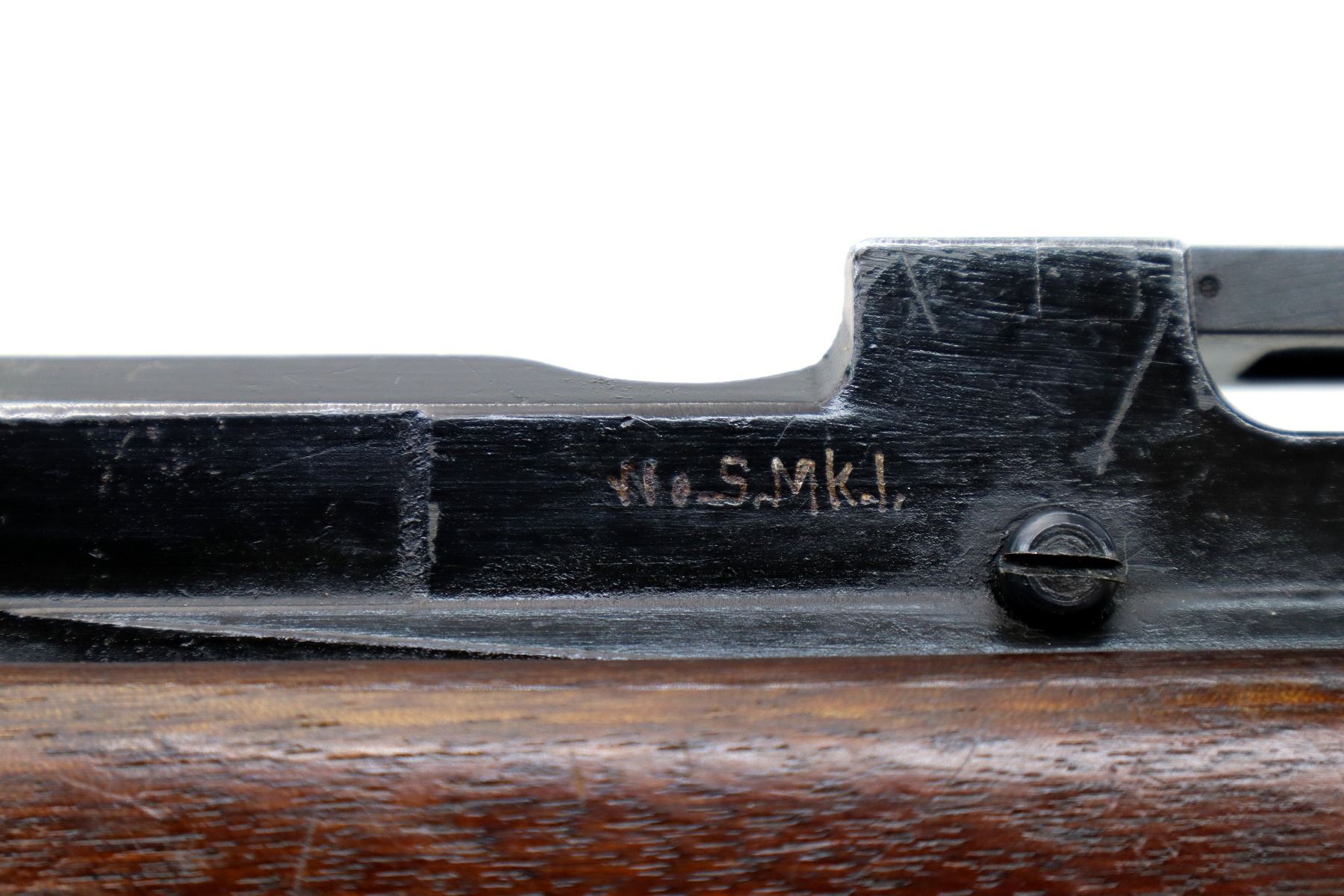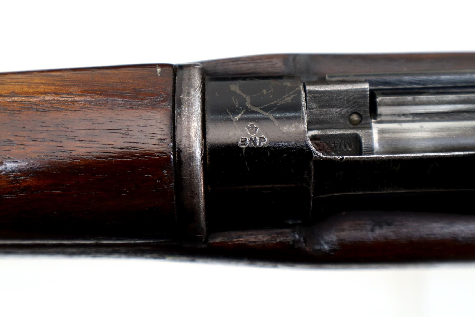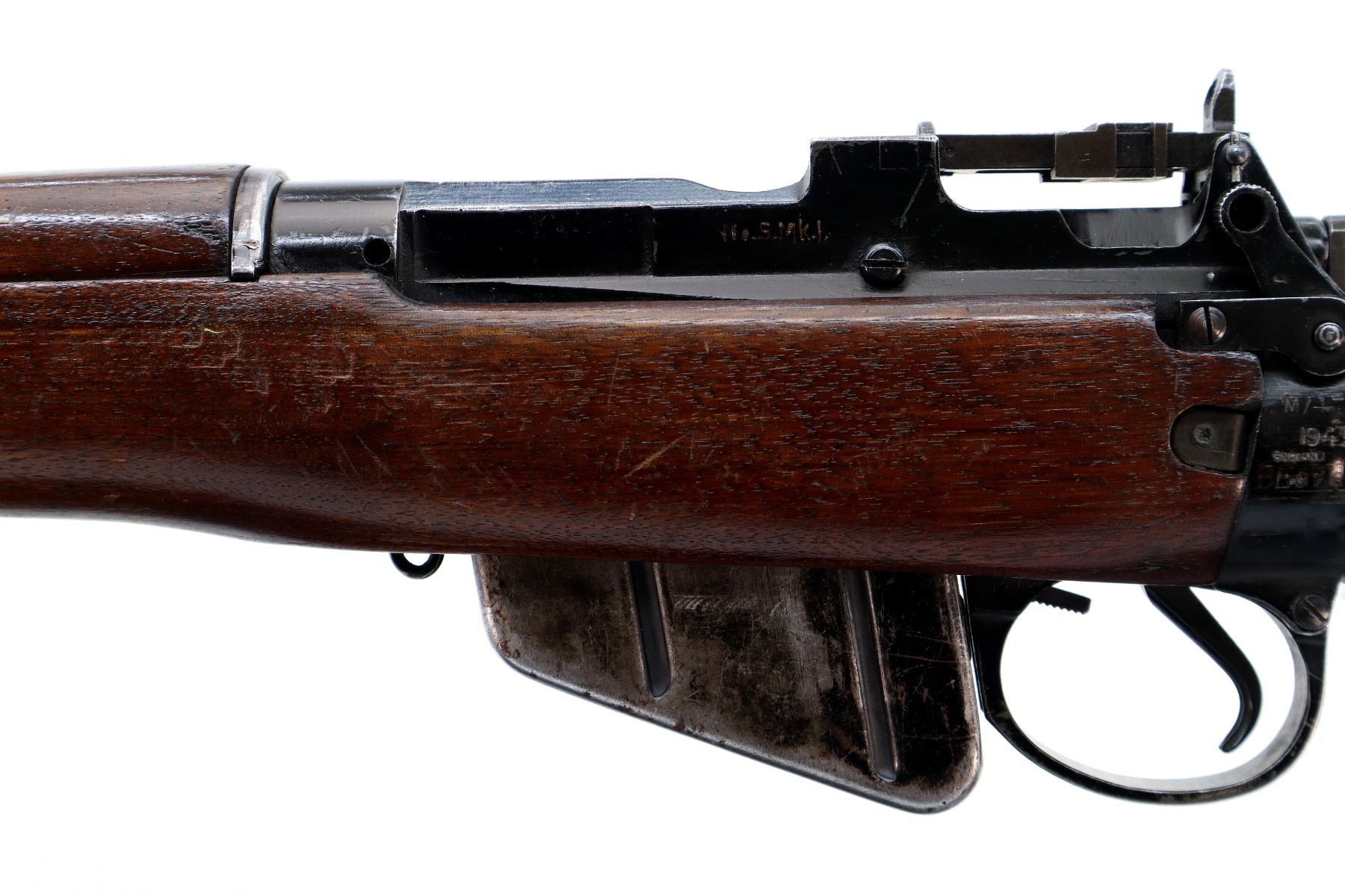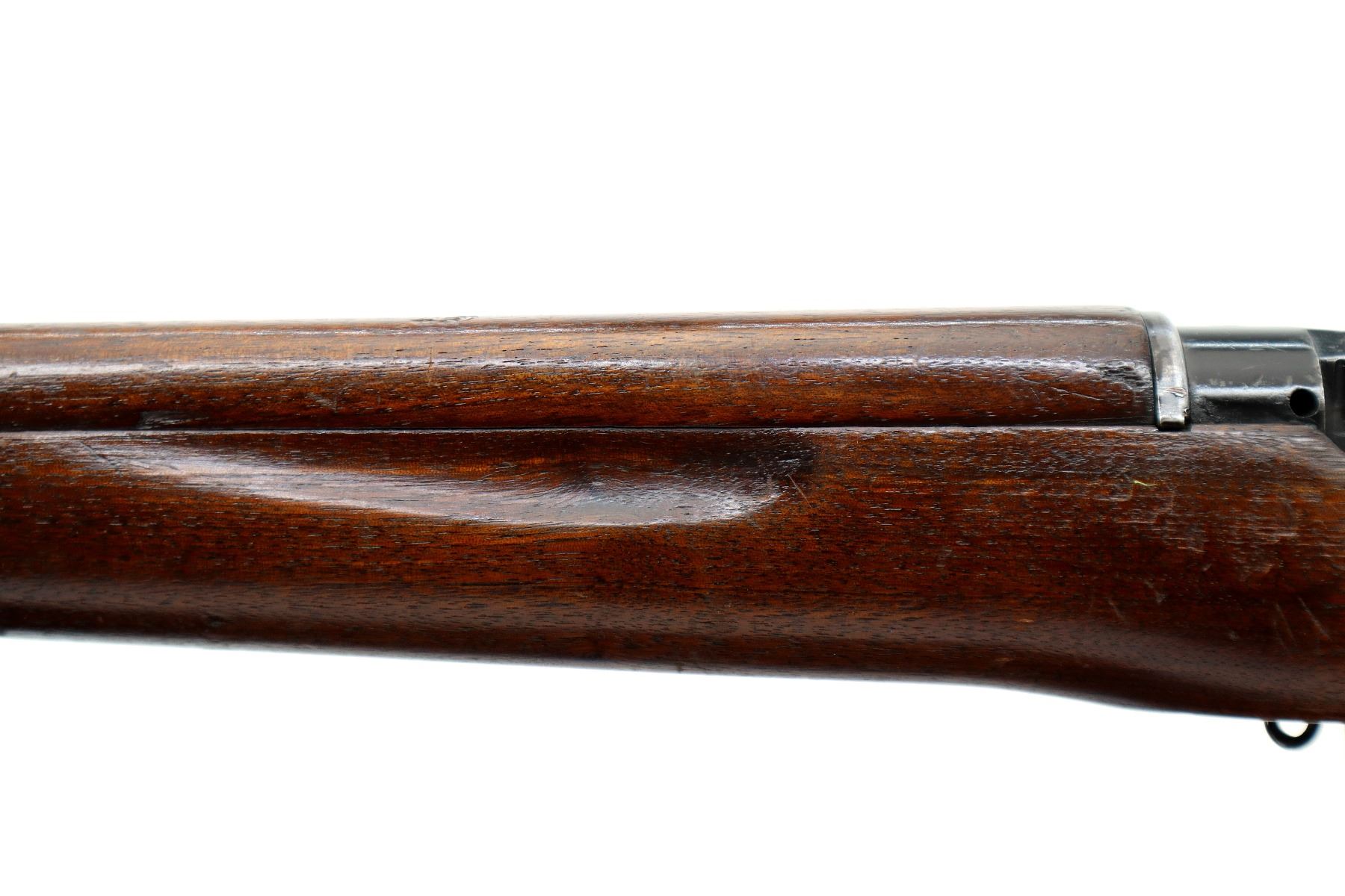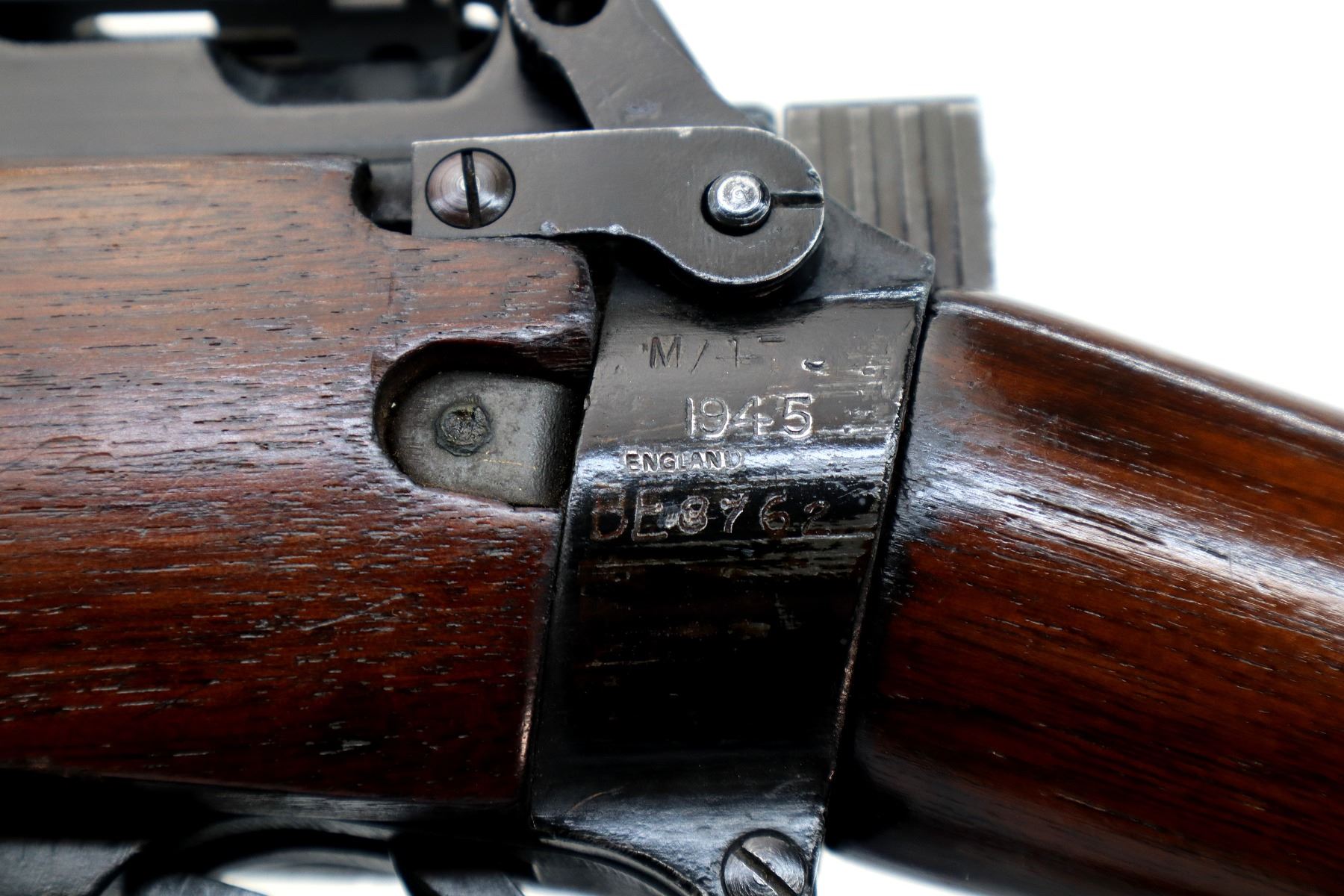 Main Description: British Manufacture 1945, visible numbers match. Blade front sight with ears and ramp, adjustable 1200 yrd milled rear peep sight, black painted metal finish. Three piece full military wood stocks, replaced butt stock, pistol grip, smooth brass butt plate with trap, missing rear swivel holes are present, has the front swivel, flashider with integral bayonet lug.