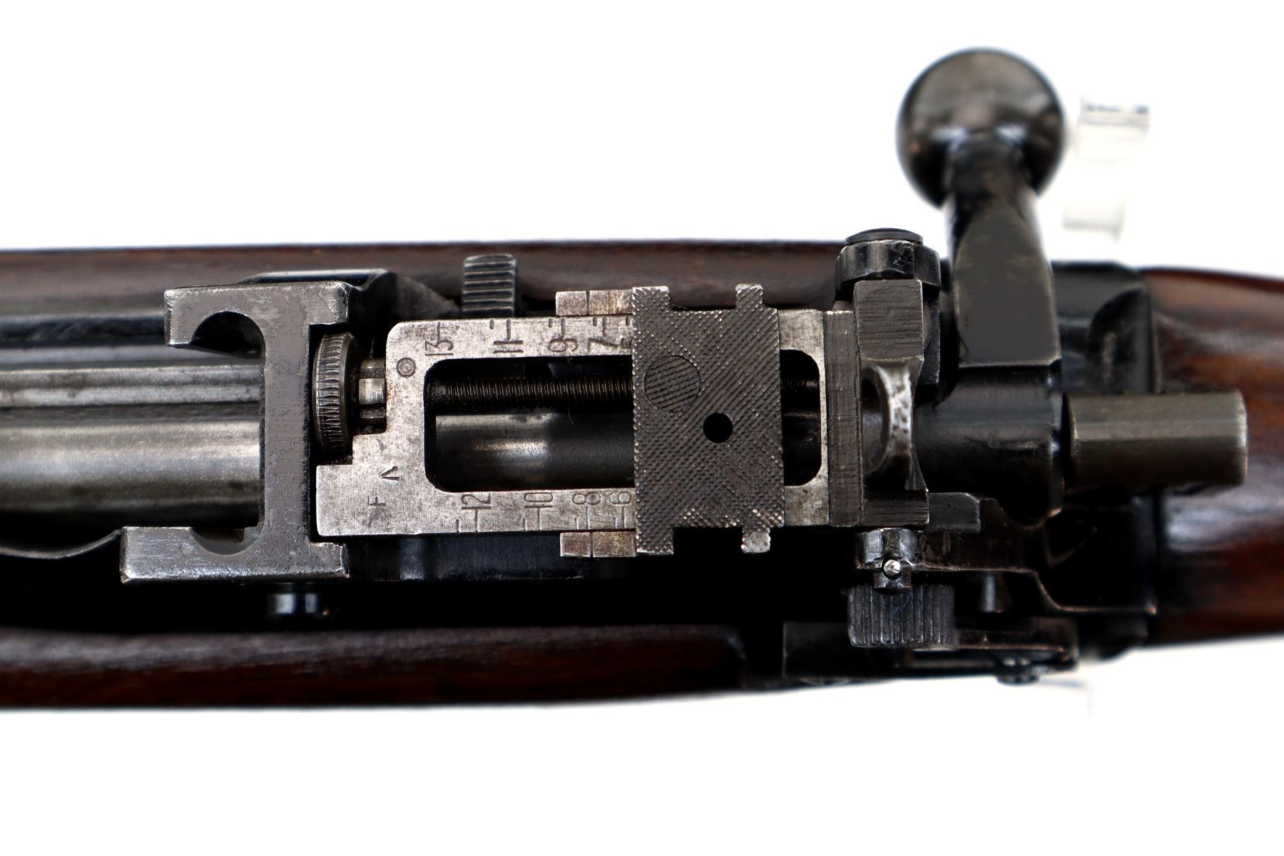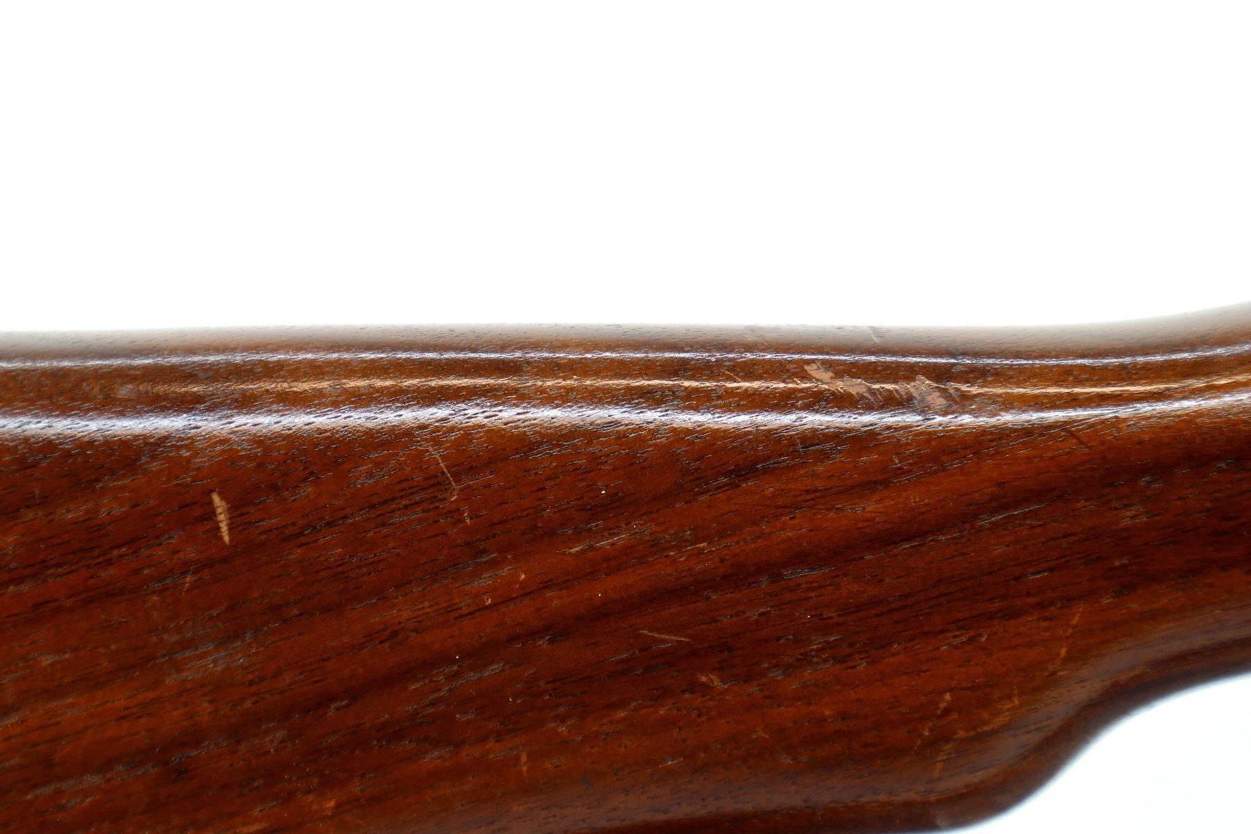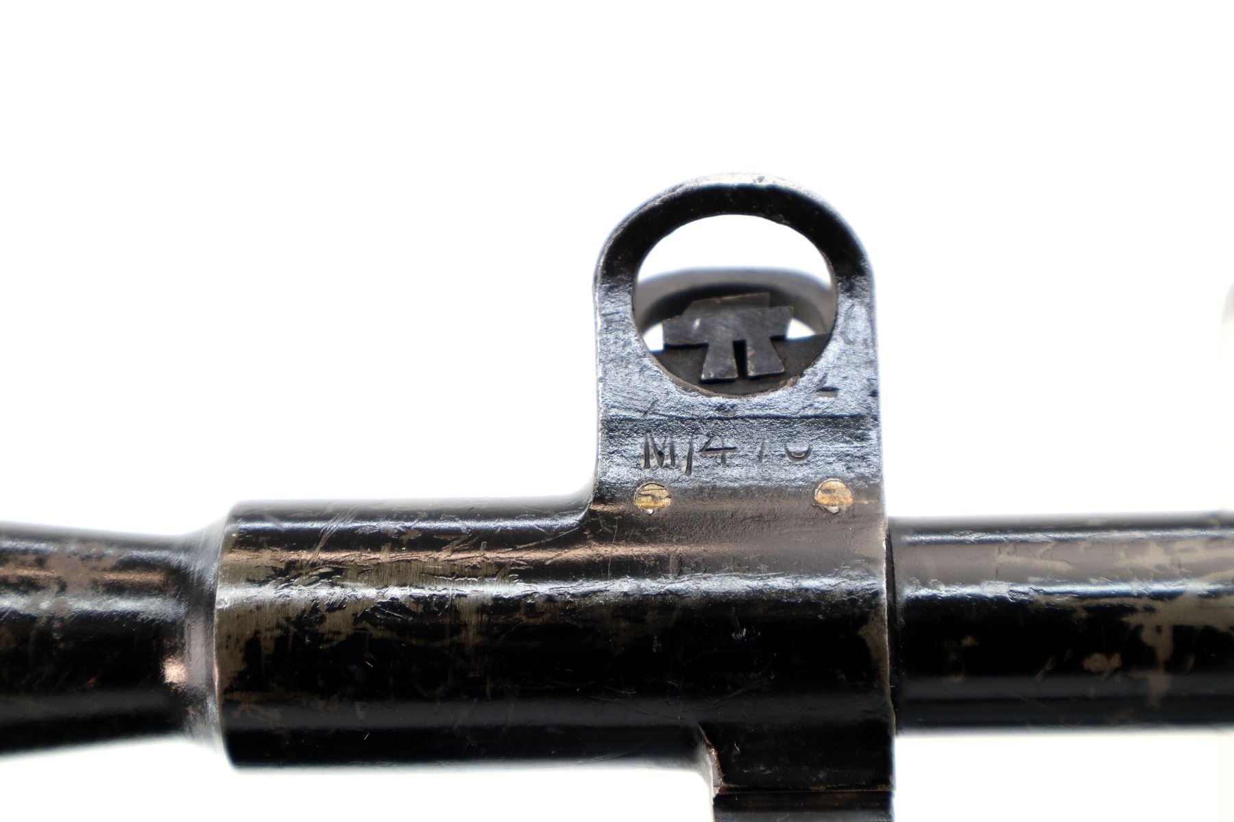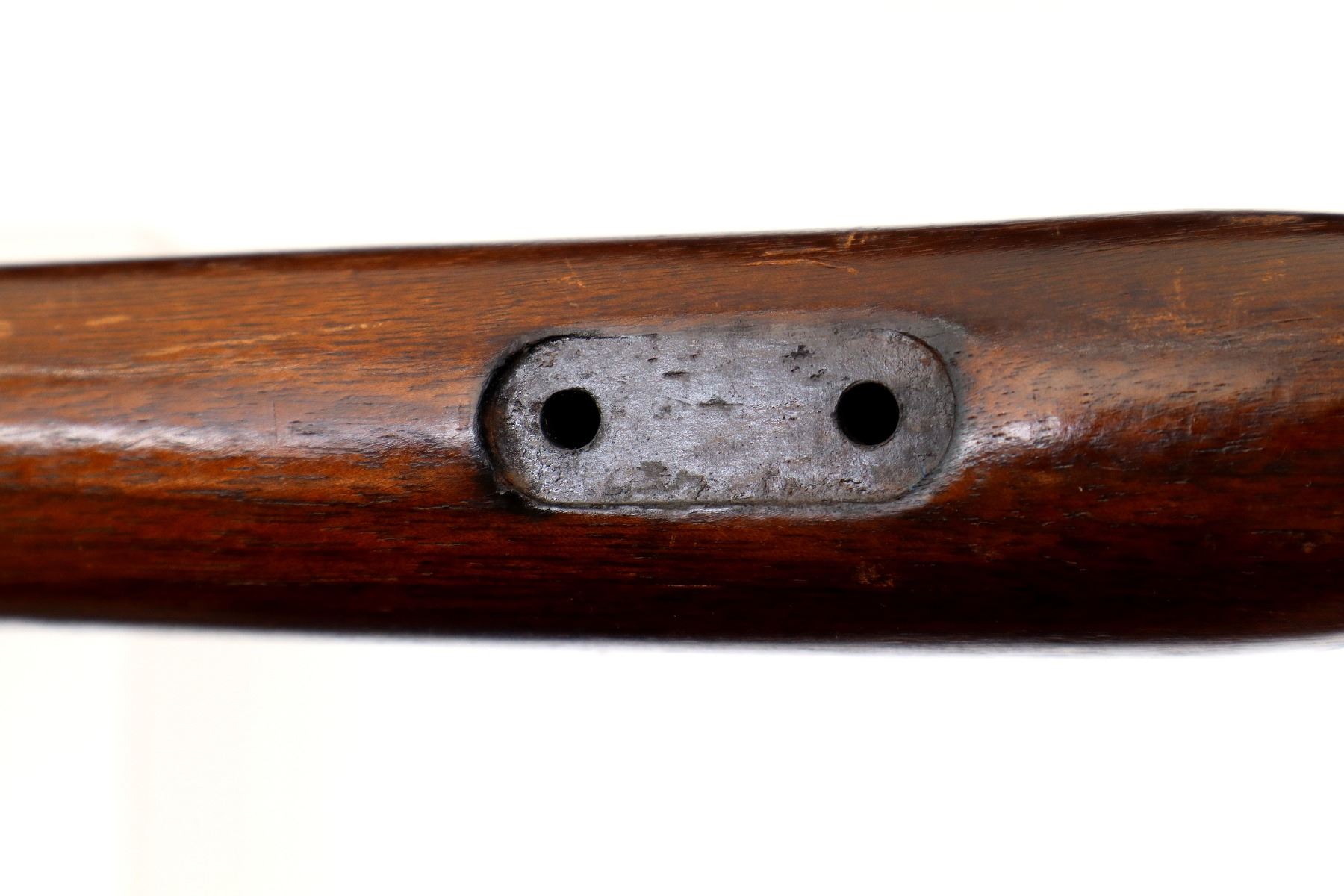 Main Description: British Manufacture 1945, visible numbers match. Blade front sight with ears and ramp, adjustable 1200 yrd milled rear peep sight, black painted metal finish. Three piece full military wood stocks, replaced butt stock, pistol grip, smooth brass butt plate with trap, missing rear swivel holes are present, has the front swivel, flashider with integral bayonet lug.