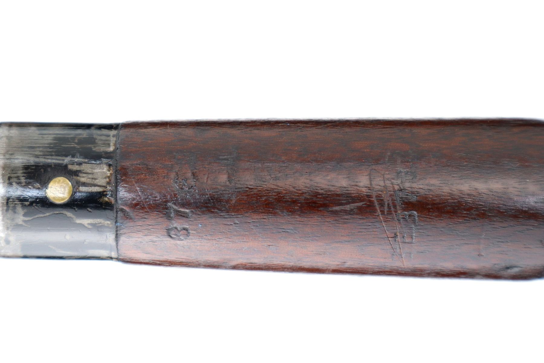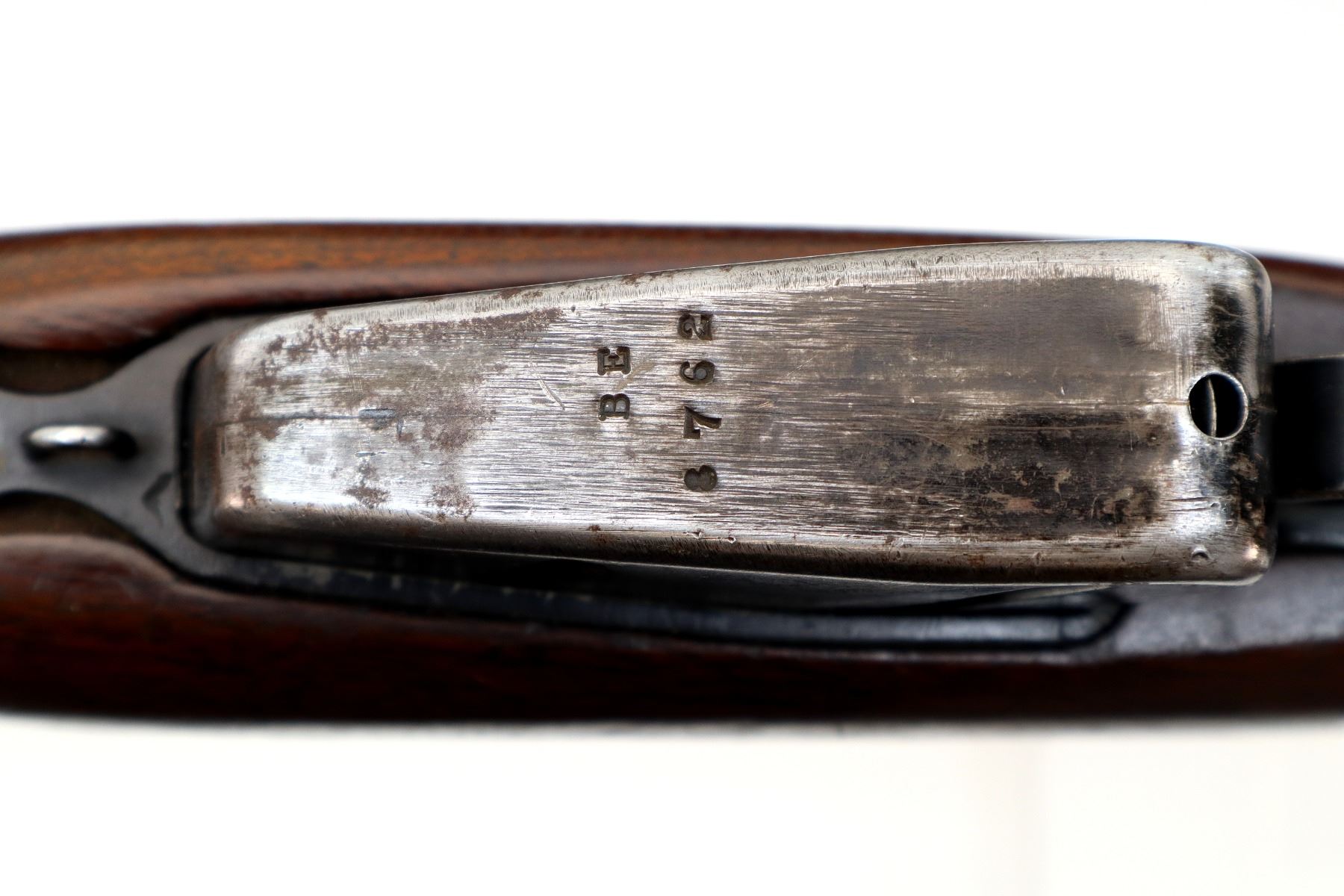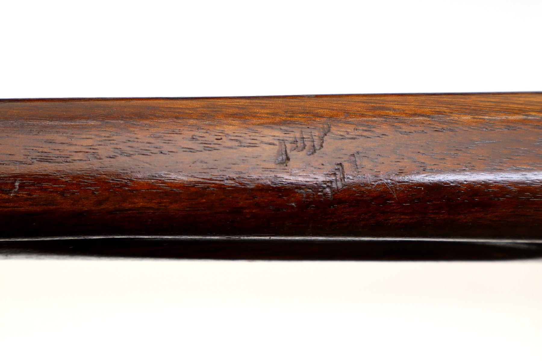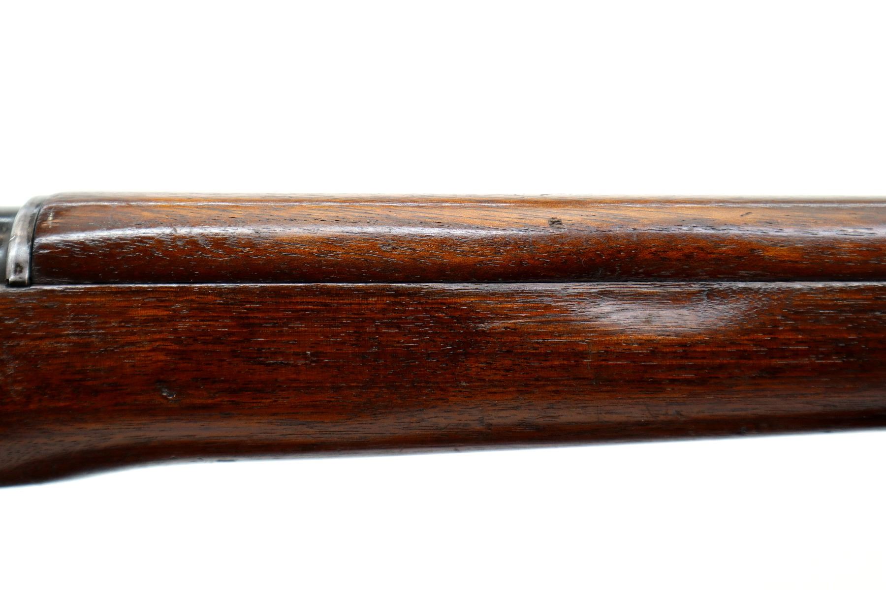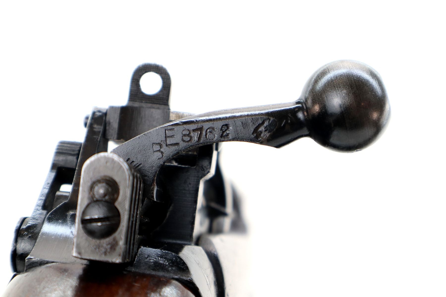 Main Description: British Manufacture 1945, visible numbers match. Blade front sight with ears and ramp, adjustable 1200 yrd milled rear peep sight, black painted metal finish. Three piece full military wood stocks, replaced butt stock, pistol grip, smooth brass butt plate with trap, missing rear swivel holes are present, has the front swivel, flashider with integral bayonet lug.