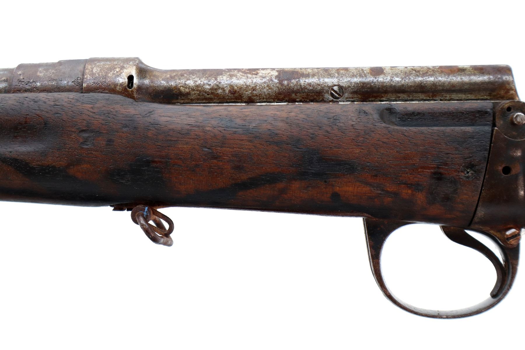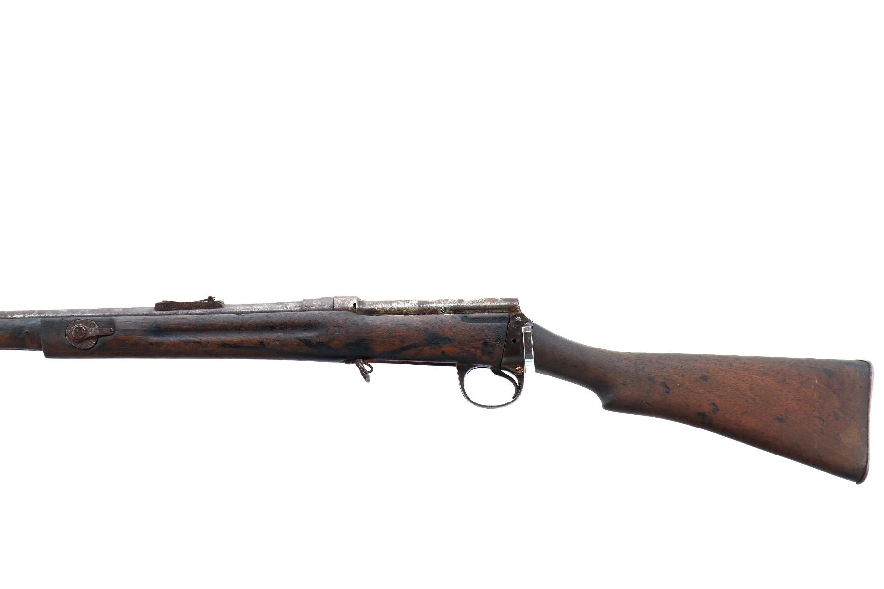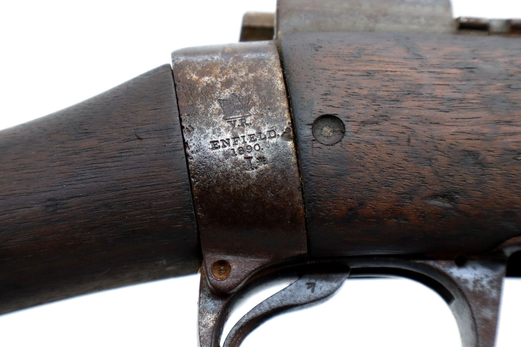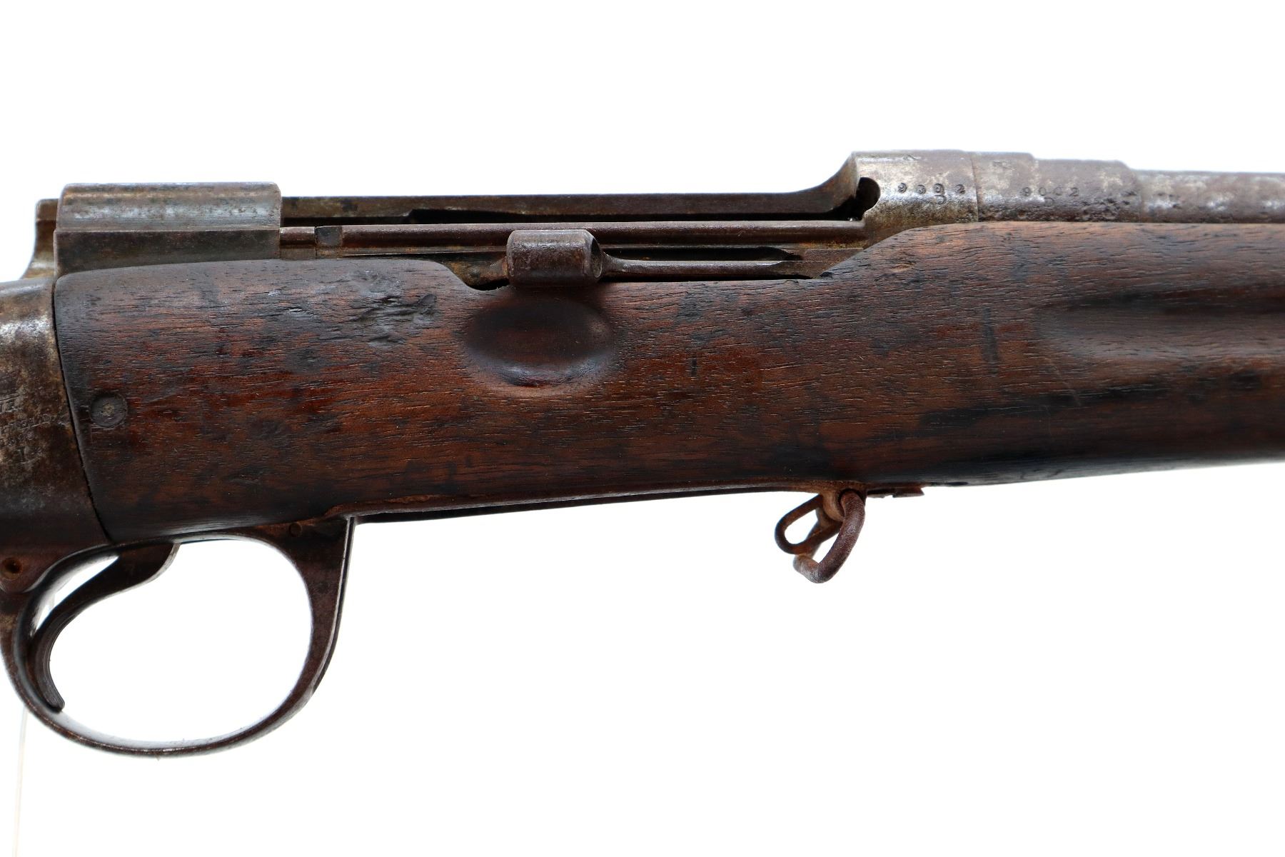 Main Description: Does not function mechanically as designed, Manufactured by Enfield 1890. Blade front sight with ramp, missing rear sight ladder, has the base and spring, has a magazine cut off, missing complete bolt, rear volley sight, barrel bands, nose cap and cleaning rod. Has Two piece full military wood stocks, forearm is chipped, cracked and broken, pistol grip, smooth steel butt plate with trap, stock cracked at heel and toe, has a steel stock disk missing screw.