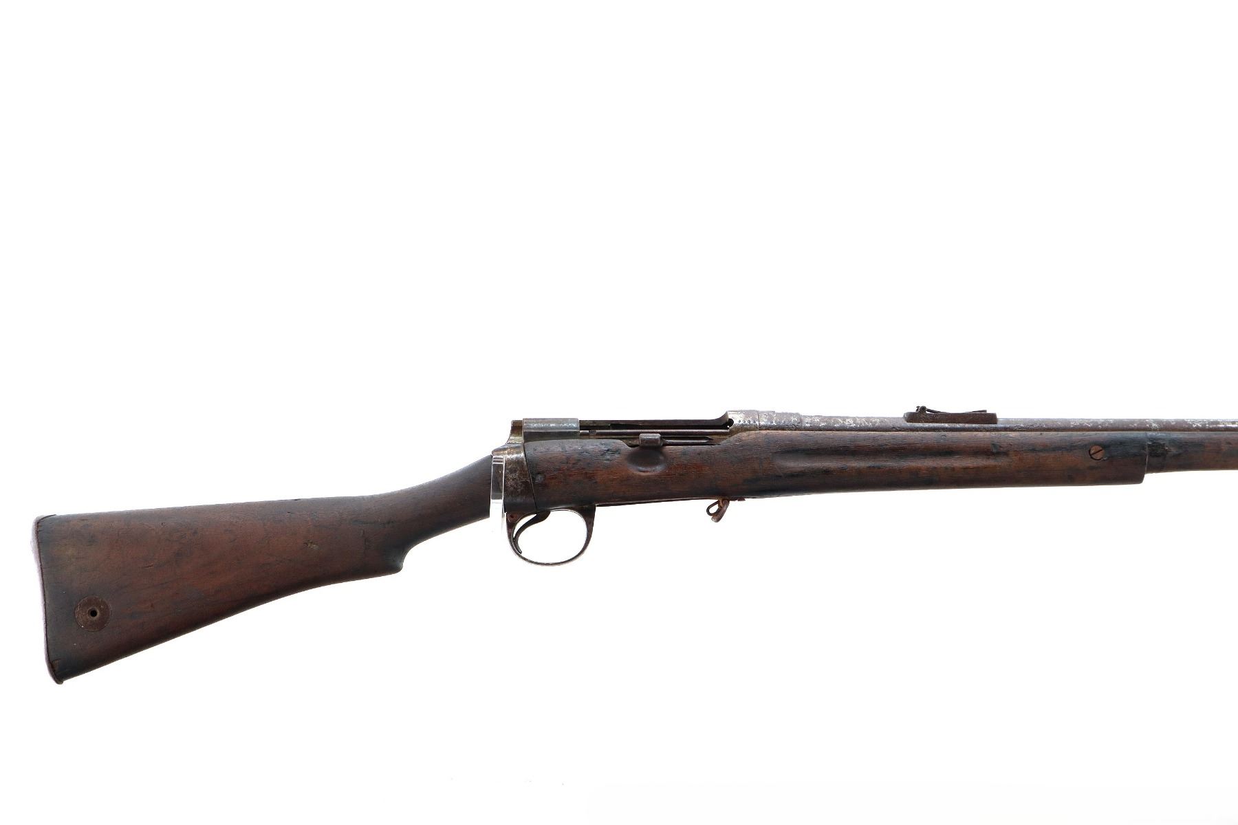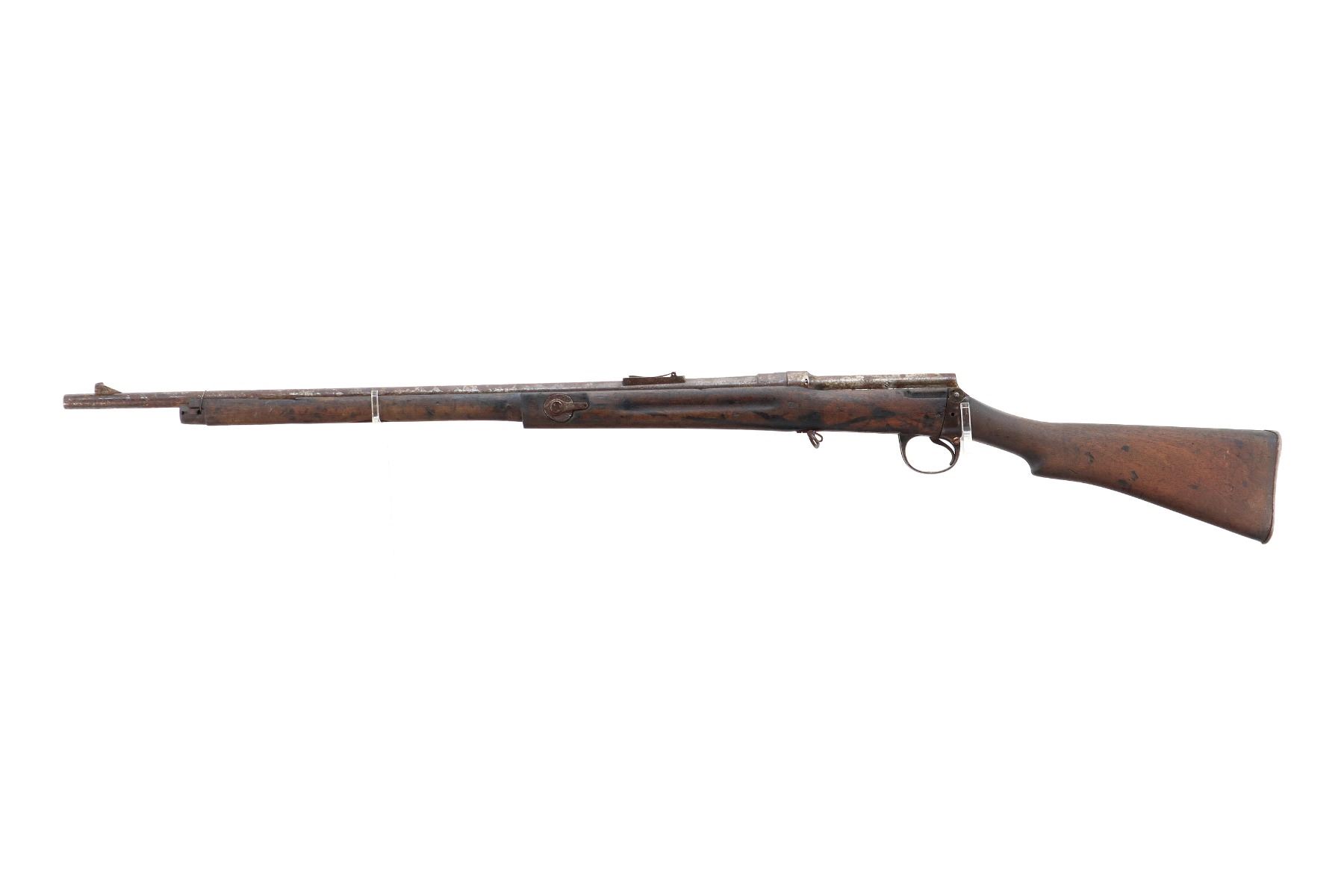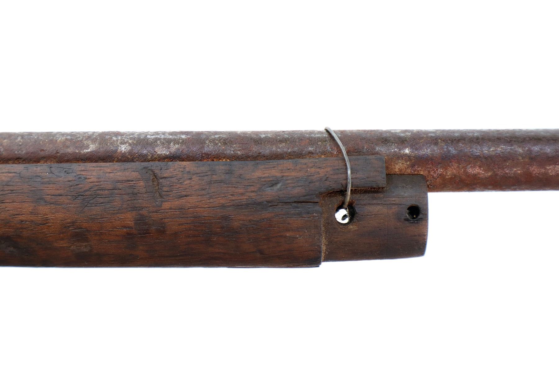 Main Description: Does not function mechanically as designed, Manufactured by Enfield 1890. Blade front sight with ramp, missing rear sight ladder, has the base and spring, has a magazine cut off, missing complete bolt, rear volley sight, barrel bands, nose cap and cleaning rod. Has Two piece full military wood stocks, forearm is chipped, cracked and broken, pistol grip, smooth steel butt plate with trap, stock cracked at heel and toe, has a steel stock disk missing screw.