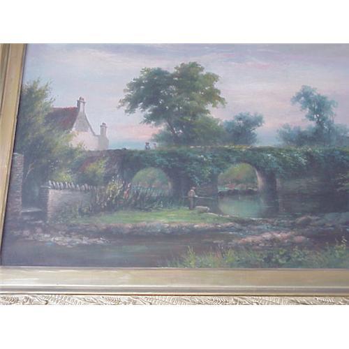<table width="100%" border="0" cellspacing="0" cellpadding="4"><tr><td><em> Original Victorian ornate frame to the painting</em></td></tr><tr> <td width="100%"> Beautiful Victorian oil on canvas painting by prominent English Victorian listed artist H.Clements. This an oil painting of a quaint country inn scene, a couple conversing on the stone ivy covered bridge while a gentleman is fishing in the stream. The Inn is Whyte Horse Inn. The painting is full of Victorian charm and dates from the late 1880s . The frame is original to the painting and is a gorgeous floral pattern with rich gilding. The overall measurements are 39 ¾ inches by 30 inches, the painting itself is about 30 inches by 21 inches. The painting is in excellent condition with no restoration, the frame also is in very fine condition. It�s a most beautiful original Victorian painting by a well listed artist, that is highly decorative. A choice addition to your collection of art. If you enjoy collecting art then you may wish to bookmark our site, since we will be listing more paintings. </td></tr><tr> <td> </td></tr><tr> <td>Reference #: GAFOP800</td></tr><tr><td>Condition:Excellent! ALL ORIGINAL</td></tr><tr><td>Year:1880s</td></tr><tr><td>Title:BRITISH LISTED VICTORIAN OIL PAINTING</td></tr><tr><td>Location:WA</td></tr></table>