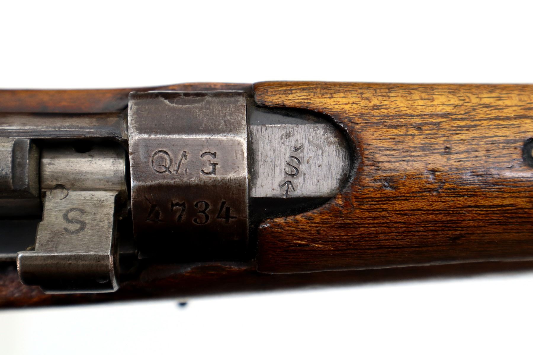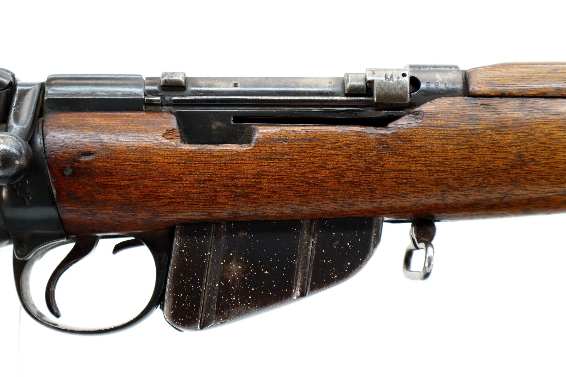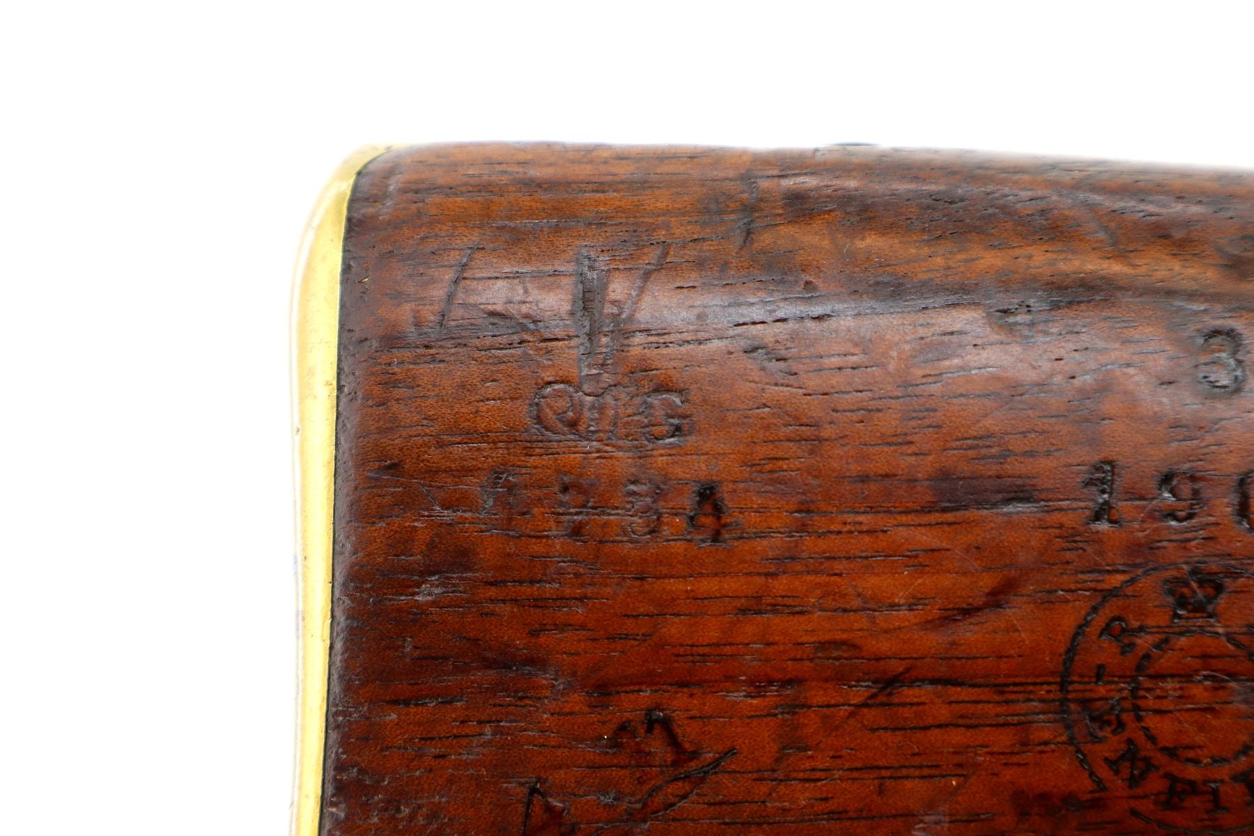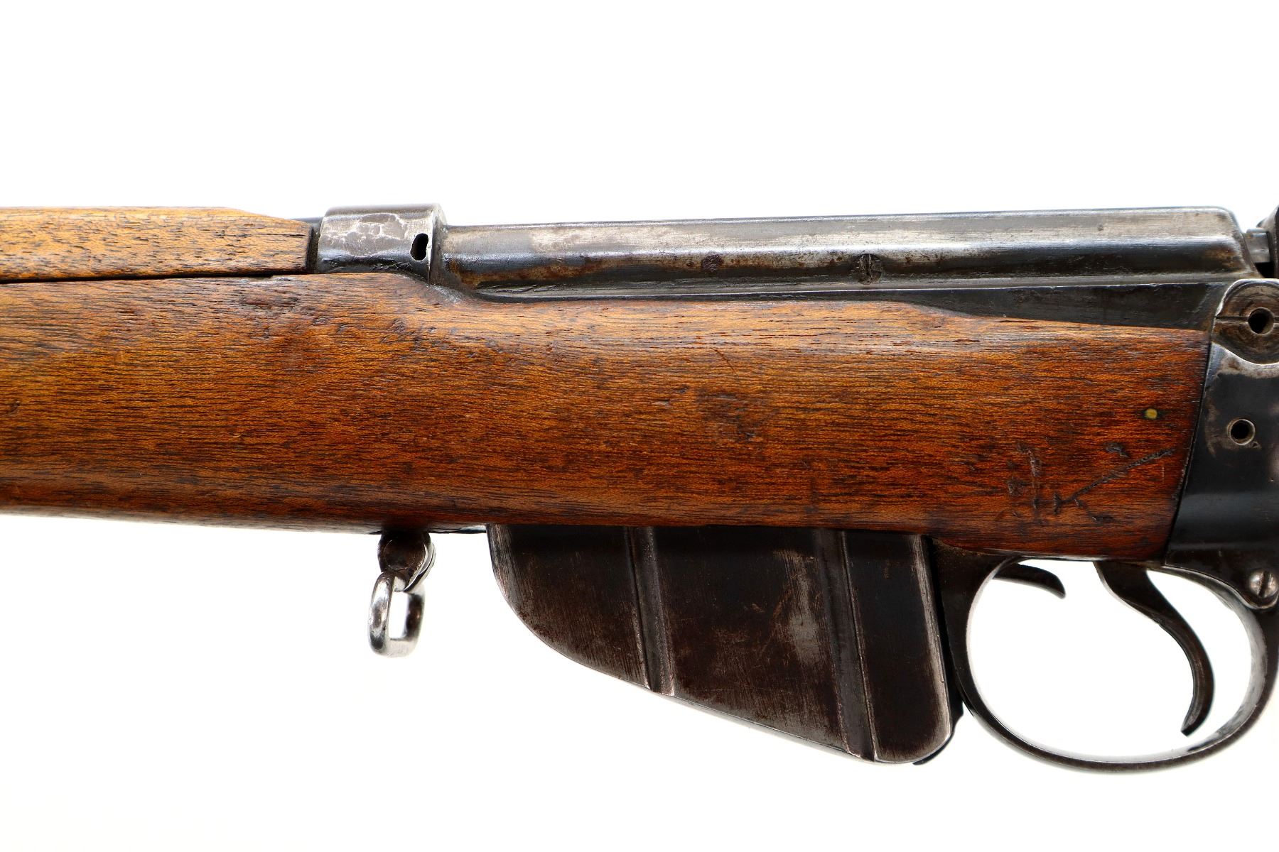 Main Description: Manufactured by Enfield 1901, bolt mismatched. This rifle has QG and additional number 4734 on receiver ring with an Australian heavy barrel installed. Blade front sight with ramp, adjustable u notched rear sight, blued finish, safety on cocking piece, missing rear volley sight. Three piece sporterized wood stocks, pistol grip, smooth brass butt plate with unmarked tang, various faint markings on right side of stock, missing rear sling swivel hole is present, has a swivel in front of trigger guard.