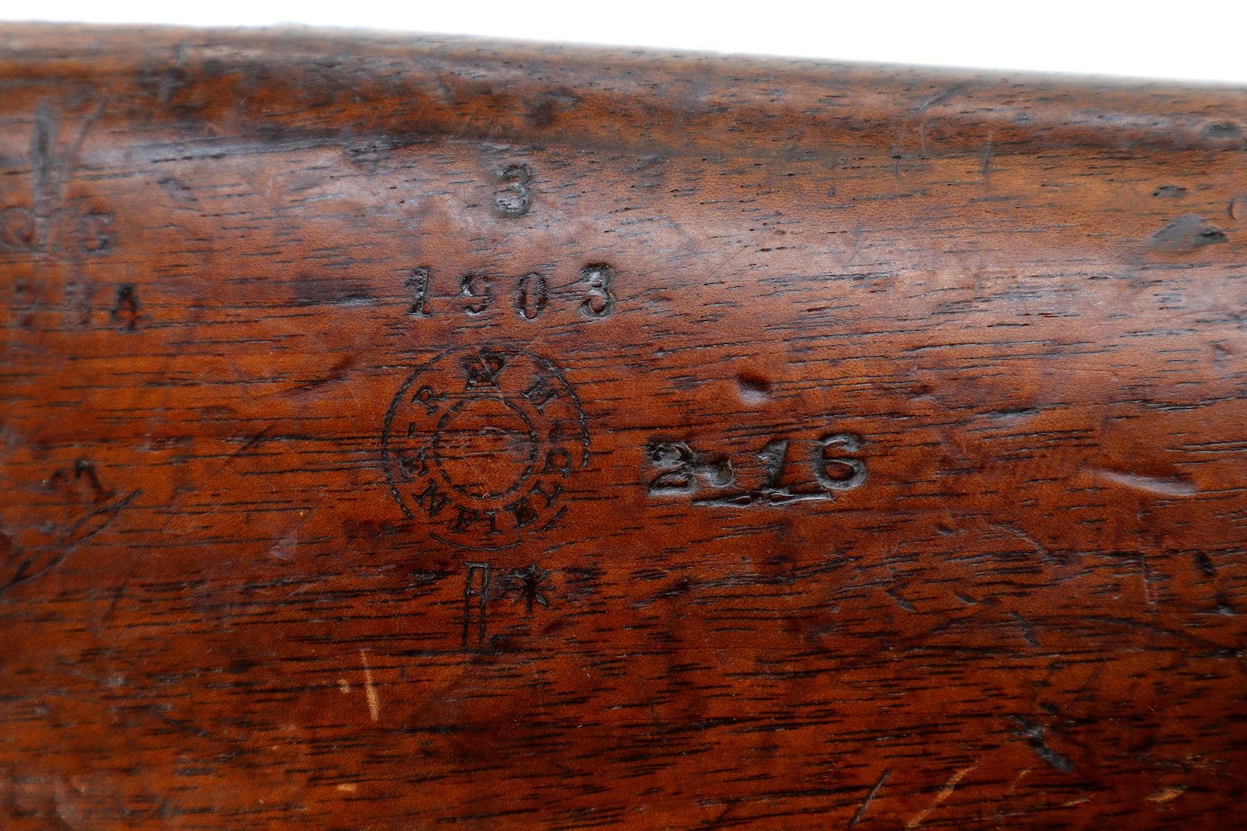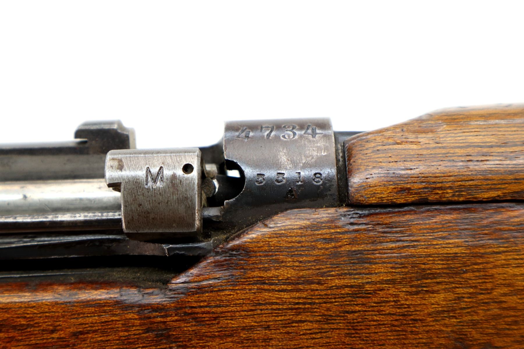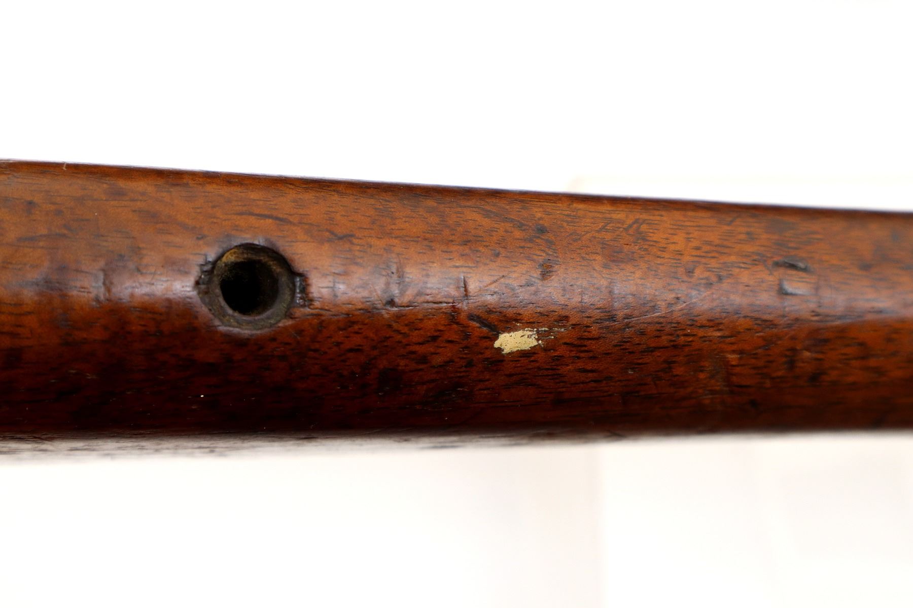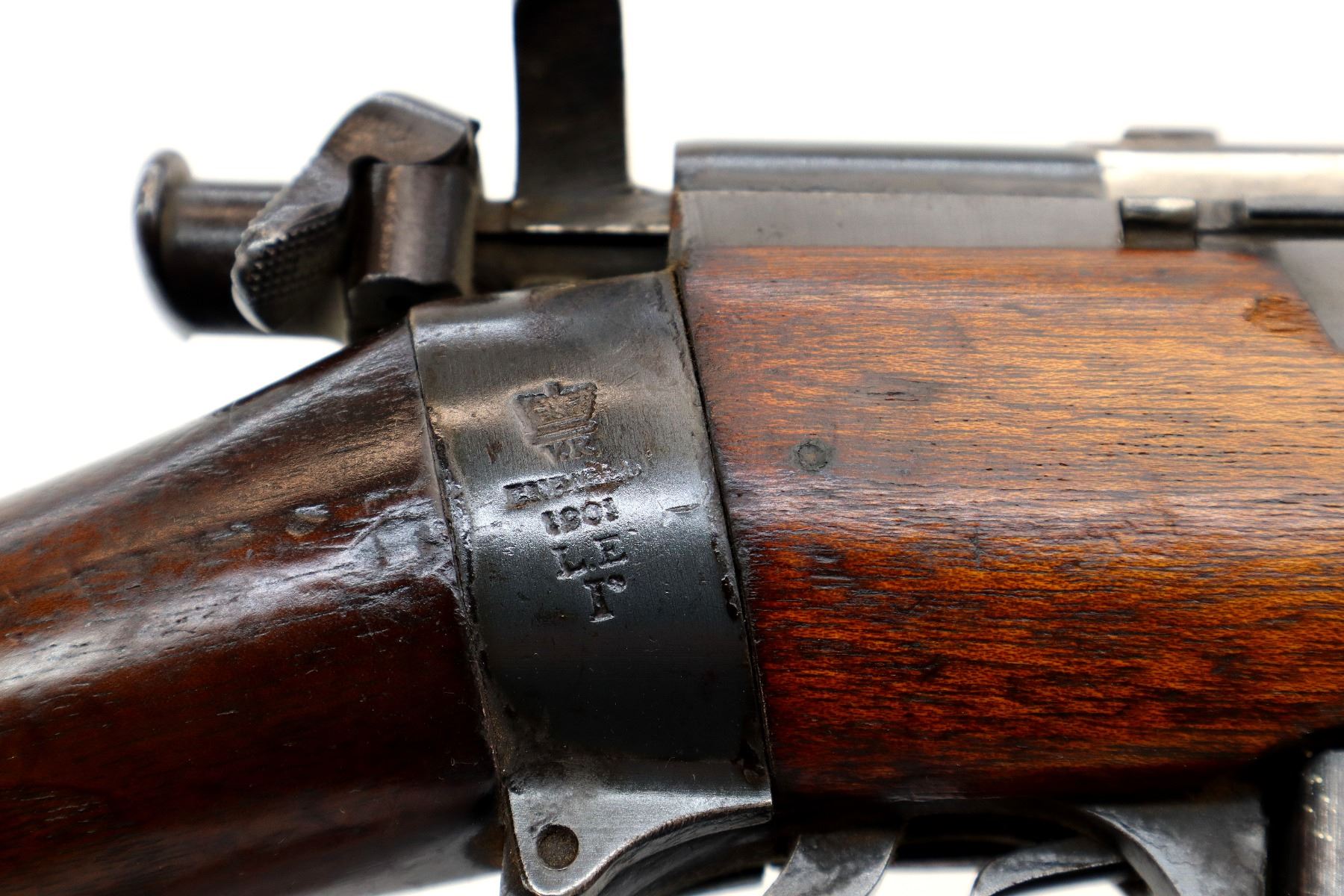 Main Description: Manufactured by Enfield 1901, bolt mismatched. This rifle has QG and additional number 4734 on receiver ring with an Australian heavy barrel installed. Blade front sight with ramp, adjustable u notched rear sight, blued finish, safety on cocking piece, missing rear volley sight. Three piece sporterized wood stocks, pistol grip, smooth brass butt plate with unmarked tang, various faint markings on right side of stock, missing rear sling swivel hole is present, has a swivel in front of trigger guard.