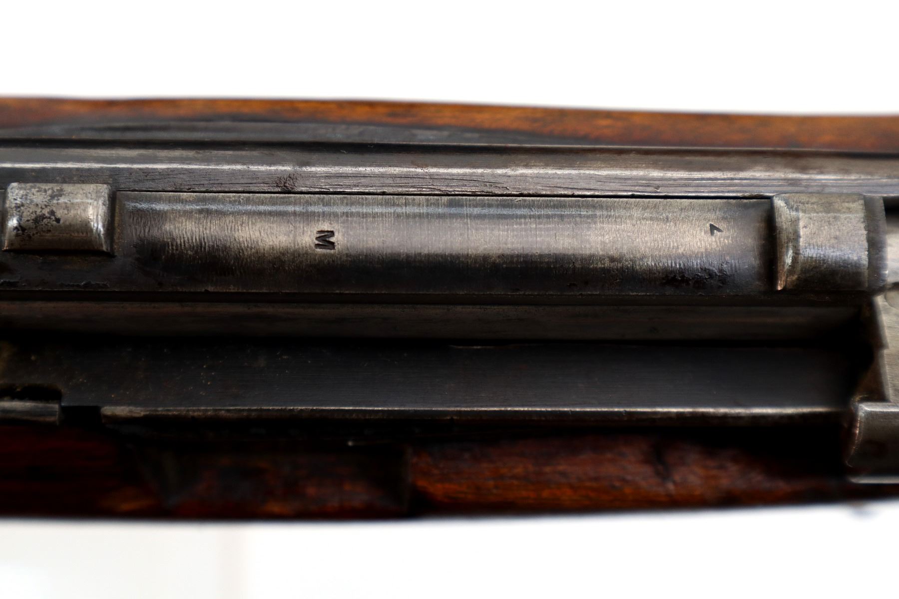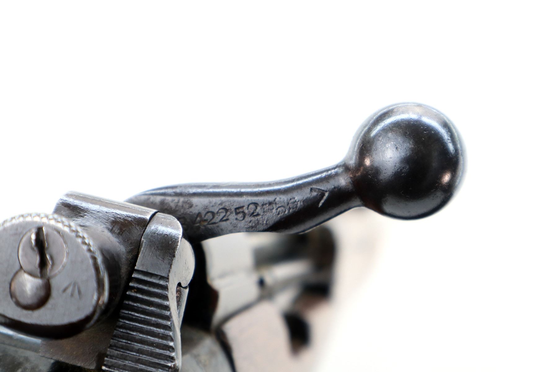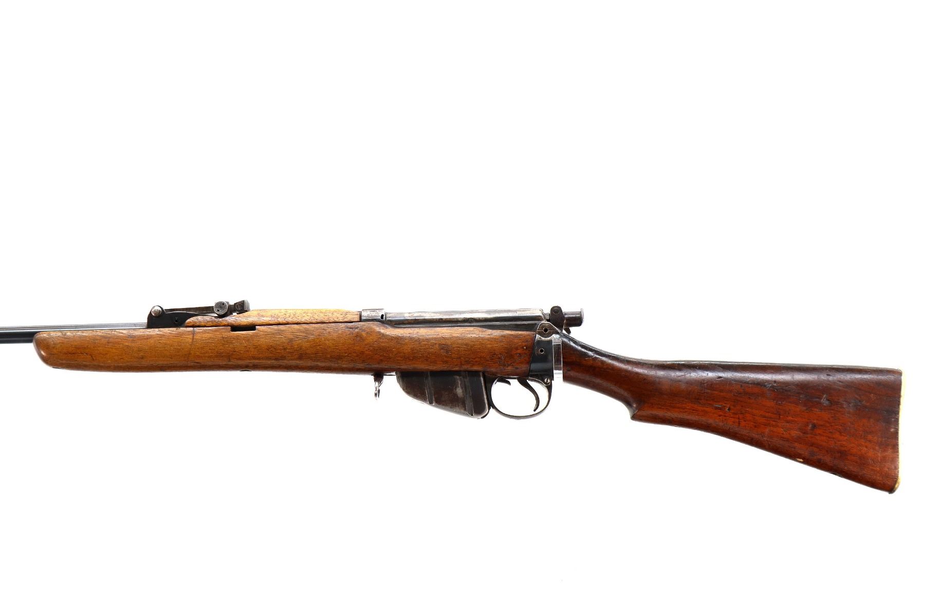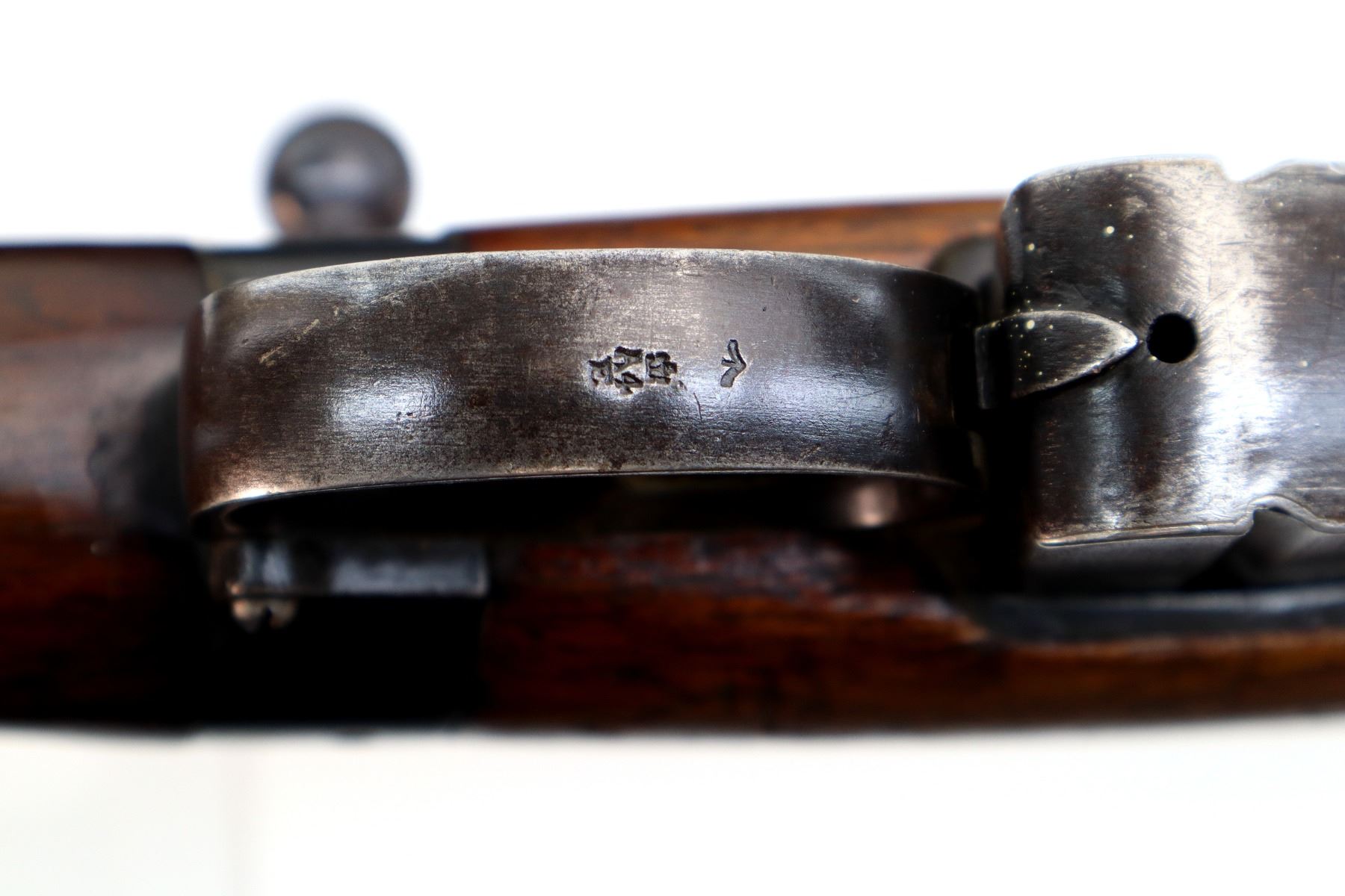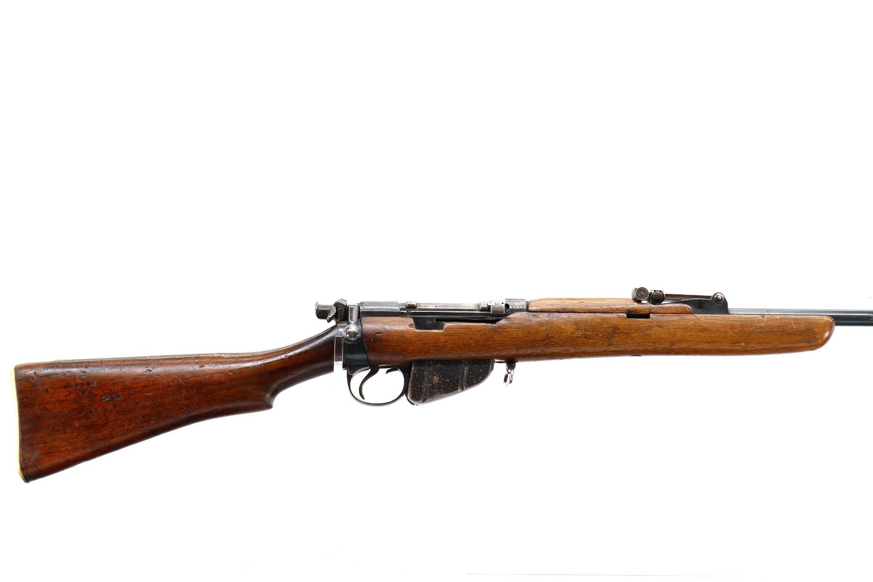 Main Description: Manufactured by Enfield 1901, bolt mismatched. This rifle has QG and additional number 4734 on receiver ring with an Australian heavy barrel installed. Blade front sight with ramp, adjustable u notched rear sight, blued finish, safety on cocking piece, missing rear volley sight. Three piece sporterized wood stocks, pistol grip, smooth brass butt plate with unmarked tang, various faint markings on right side of stock, missing rear sling swivel hole is present, has a swivel in front of trigger guard.