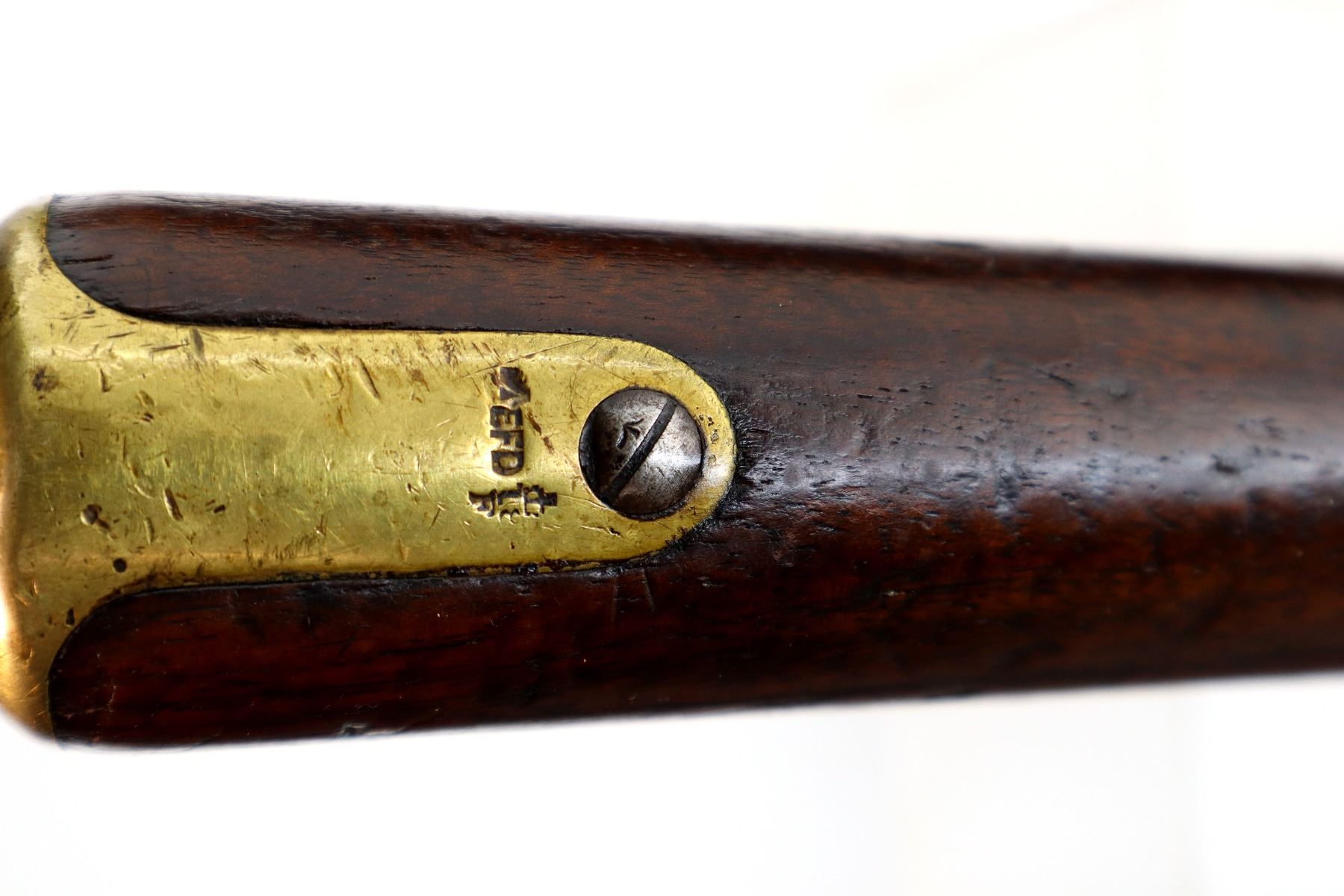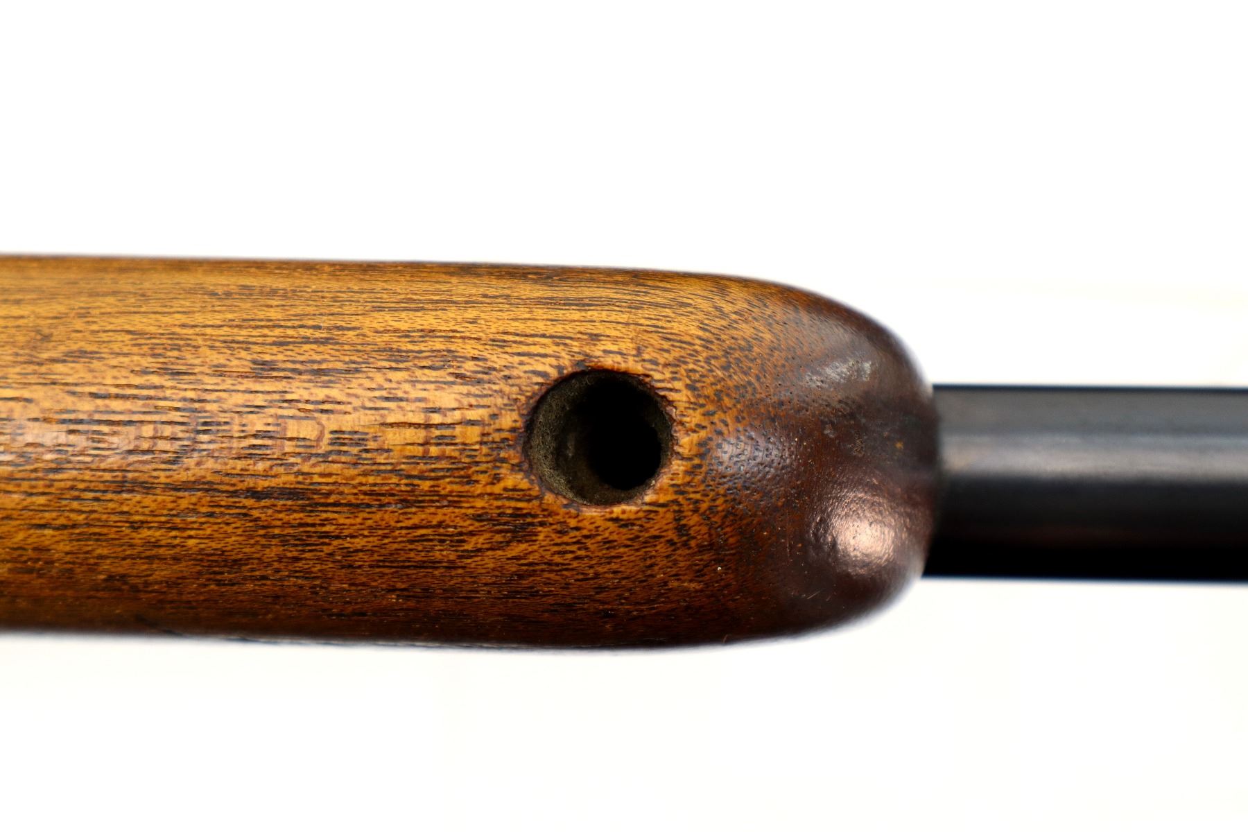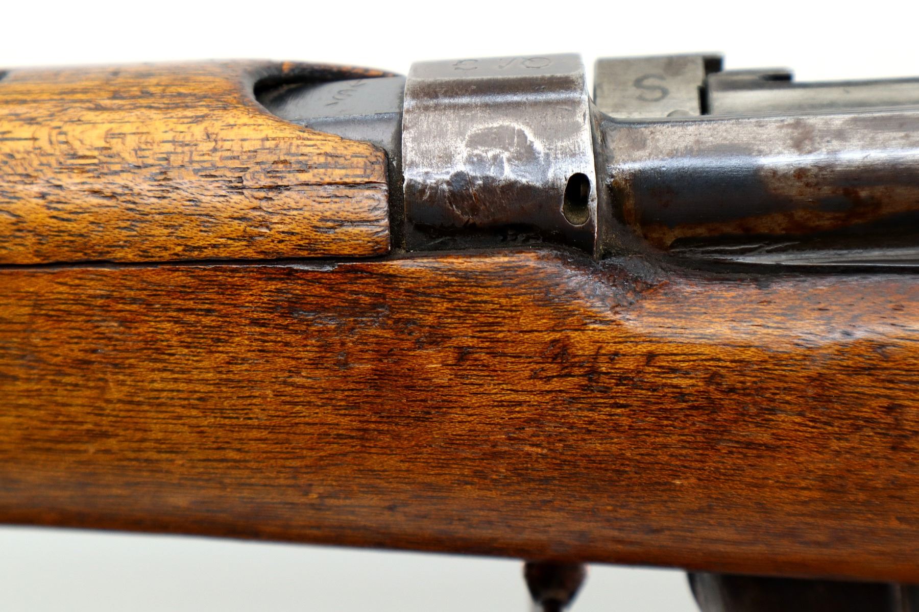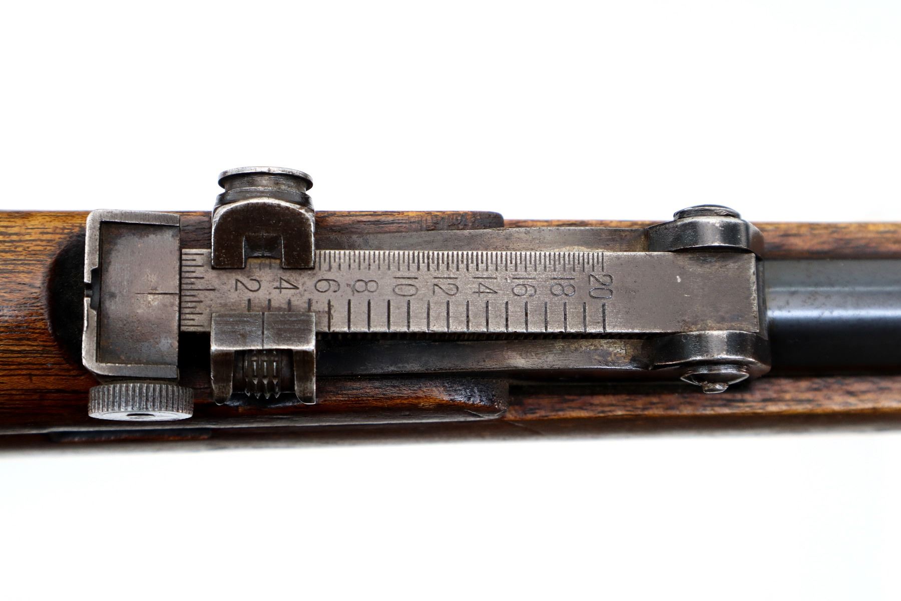 Main Description: Manufactured by Enfield 1901, bolt mismatched. This rifle has QG and additional number 4734 on receiver ring with an Australian heavy barrel installed. Blade front sight with ramp, adjustable u notched rear sight, blued finish, safety on cocking piece, missing rear volley sight. Three piece sporterized wood stocks, pistol grip, smooth brass butt plate with unmarked tang, various faint markings on right side of stock, missing rear sling swivel hole is present, has a swivel in front of trigger guard.