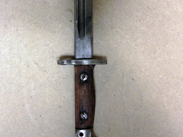 THIS IS A GREAT LOOKING ORIGINAL LONG BRIT BAYONET MODEL 1907---17" BLADE MARKED "SANDERSON" 1907 WITH REGIMENTAL STAMPIGS AND BROAD ARROWS ON RICASSO--CROWN WITH "GR"--WALNUT GRIPS-RELEASE BUTTON WORKS--LEATHER SCABBARD WITH TIGHT SEWING--METAL TOP & BOTTOM WITH ALL 4 STAPLES PRESENT--TOP FITTING HAS UNIQUE THREE RIVET TOP ON BOTH SIDES-NICE PIECE