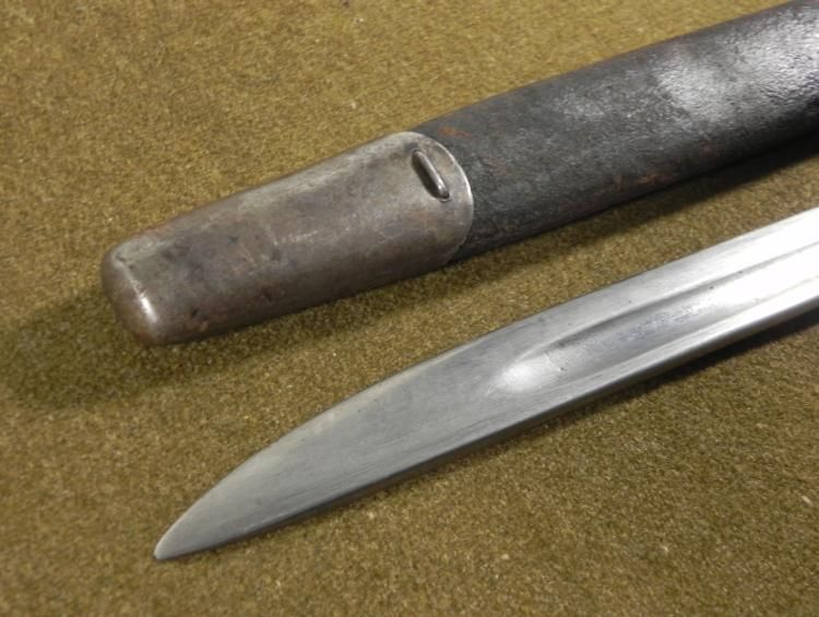BRITISH MODEL 1907 BAYONET W/MK1 SCABBARD-WELL MARKED ORIG * GREAT LOOKING 17" BLADE--RICASSO MARKED W/BROAD ARROW, UNIT MARKS AND DATED 1907--WOOD GRIPS AND RELEASE BUTTON WORKS FINE--VERY NICE BLADE--LEATHER SCABBARD WITH METAL TOP & BOTTOM FITTINGS IS SOLID WITH BOTH STAPLES PRESENT--OVERALL GREAT BAYONET PRE WWI--23" O/A LENGTH *