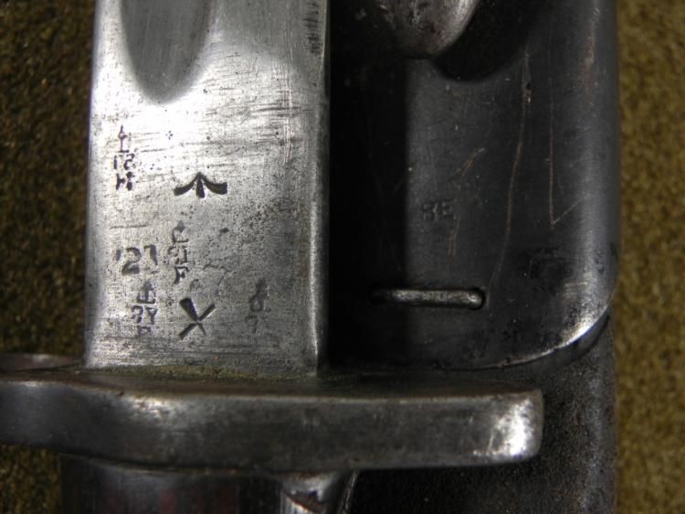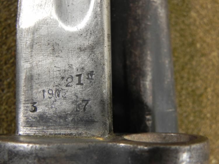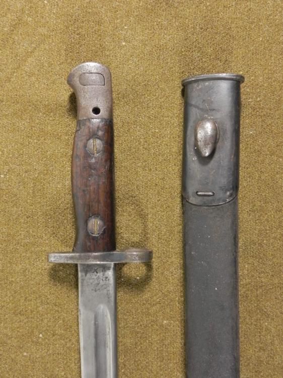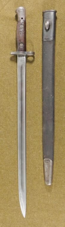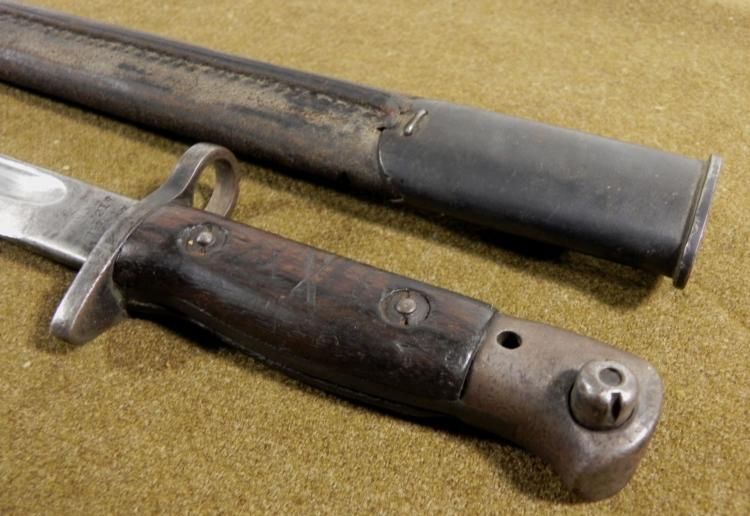 BRITISH MODEL 1907 BAYONET W/MK1 SCABBARD-WELL MARKED ORIG * GREAT LOOKING 17" BLADE--RICASSO MARKED W/BROAD ARROW, UNIT MARKS AND DATED 1907--WOOD GRIPS AND RELEASE BUTTON WORKS FINE--VERY NICE BLADE--LEATHER SCABBARD WITH METAL TOP & BOTTOM FITTINGS IS SOLID WITH BOTH STAPLES PRESENT--OVERALL GREAT BAYONET PRE WWI--23" O/A LENGTH *