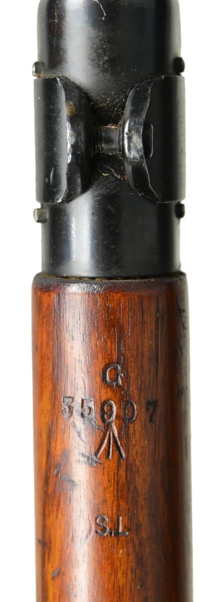 Cal. 303 Brit. S# G35907. Bbl. 25 1/2" w/ British sale proofs. Matching numbers on forend, magazine & bolt. Top of butt stock is numbered "15875". Top of receiver ring marked "ENGLAND". Left side of receiver marked "No. 4 MkI" & "T". Left side of socket marked w/ "M47C" for BSA mfg, a 1944 date, the serial number & "TR". No rear sight present. Blade front sight w/ protective ears. No. 32 scope mfg. by B.M. Co. & Numbered 10760. Scope has post reticle & good optics that have a slight green tint. Scope mount is marked "N92" & numbered "G35933". Rings are numbered "T583" & "T584" respectively. Hardwood stock set w/ cheekpiece. Bottom mounted sling swivels w/ additional sling swivel on front of trigger guard. Brown leather sling. UNATTACHED ACCESSORIES: brown leather lens covers. CONDITION: hardwood stock set shows some dings & handling marks. Metal retains 85% Suncorite finish w/ scattered flaking. Very good bore. (22-4777/MJC). CURIO. $3000-5000.