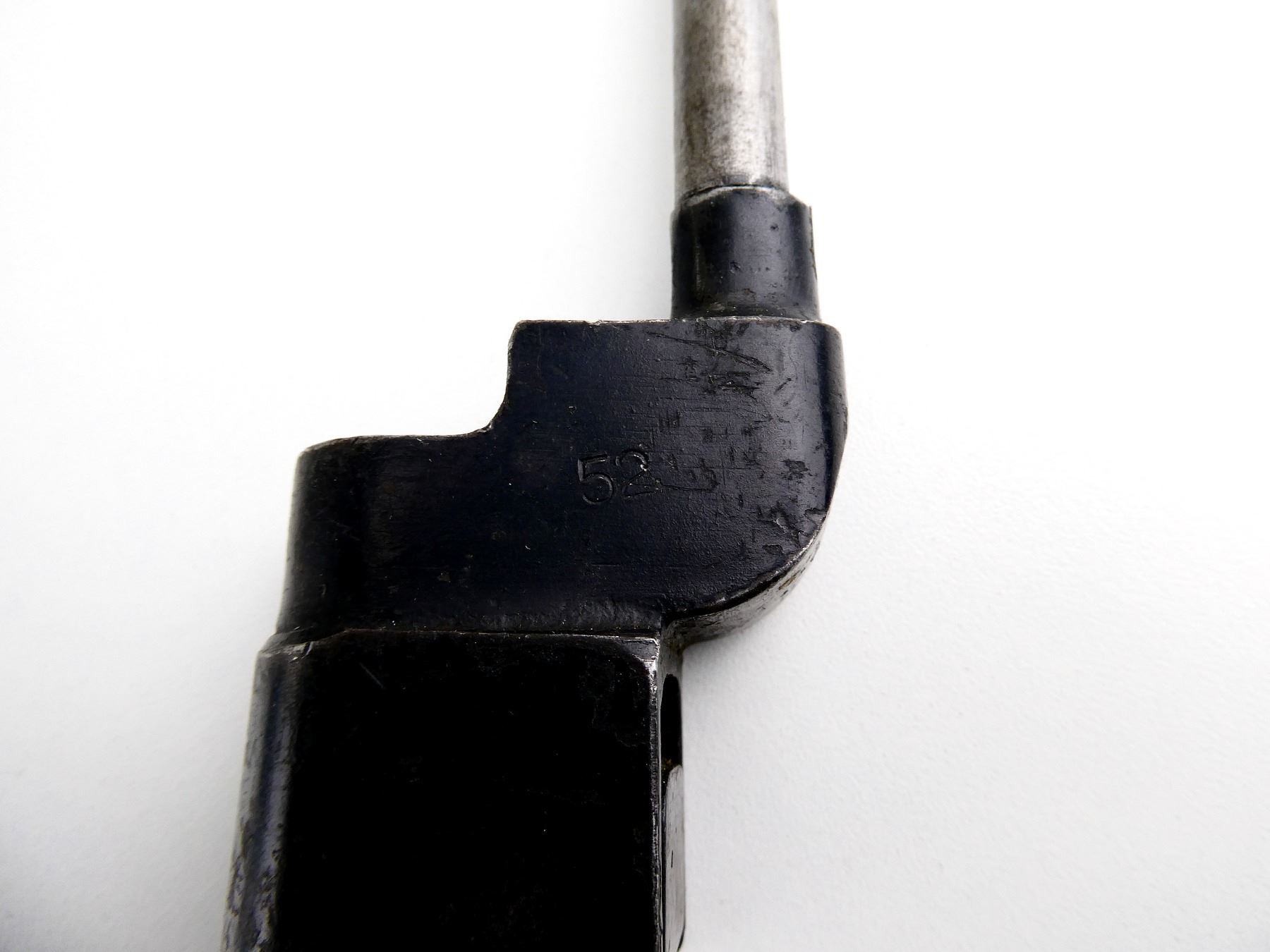 LOT INCLUDES; (1) NO.4 MKII SPIKE BAYONET, FITS LEE ENFIELD NO.4 MKI & MKII SERIES RIFLES, SOCKET MARKED WITH BROAD ARROW, RELEASE BUTTON MARKED: "N67", METAL MK. I SCABBARD, NO VISIBLE MARKINGS, BLADE APPROX. 8", OAL APPROX. 10" & (1) NO.4 MKII* SPIKE BAYONET, FITS LEE ENFIELD NO.4 MKI & MKII SERIES RIFLES, SOCKET FAINTLY MARKED: "??4 MK II*, PSK" & "52", METAL MK. I SCABBARD, NO VISIBLE MARKINGS, THROAT IS LOOSE, BLADE APPROX. 8" & OAL APPROX. 9 7/8". SEE PHOTOS.