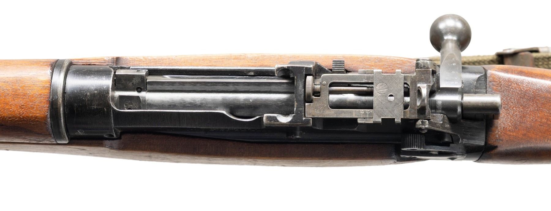 Cal. 303 British. S# AA6532. Numbers match on receiver & bolt. Bbl. 20 5/8" including cone type flash suppressor. Barrel is marked on top left over forend tip w/ British export proofs. Receiver is marked on left side in electro-pencil "NO5 MK1 (F) / 5-47 manufacture date" & serial number. Rifle has the correct features including lightening cuts on the receiver & hollow bolt handle. Right receiver rail does not have boss for cutoff. Adjustable aperture rear sight correctly graduated to 800 yards. Blade front sight. Flash suppressor assembly has protective ears & bayonet lug. Buttstock is marked "S" at heel. Buttplate has black rubber pad & side-sling loop. Forend made w/ metal tip. Trigger guard has lightening cuts. Green US web sling. MAGS: one detachable unmarked 10 round. CONDITION: stock set has light wear w/ scattered handling marks. Metal retains 70% of its black original finish w/ thinning & light wear. Very good shiny bore. (25-3978/RW). CURIO. $400-600.