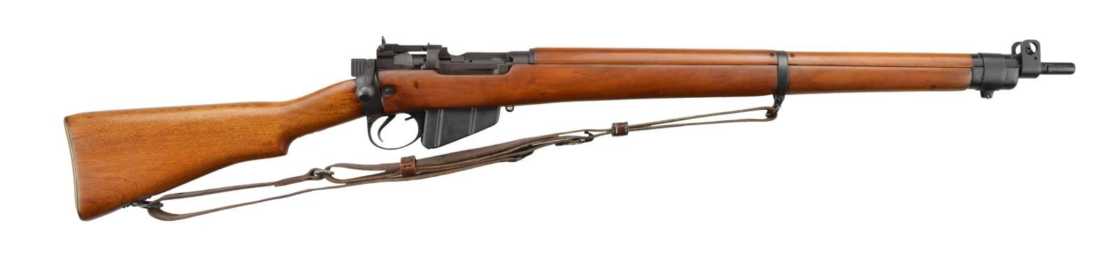 Cal. 22 LR. S #BS1876. Stock S # matches socket, other parts unnumbered. Bbl. 26" w/ British Nitro proof marking. Top of receiver ring marked with BNP proof. Left side of receiver marked "No 7. MK1 FTR", with the latter FTR marking denoting arsenal refurbishment. Left side of socket marked with S # twice. Ladder rear sight graduated to 100 yards. Protected blade front sight. Bottom mounted sling swivels w/ M1907 style sling. Hardwood beech stock set. MAGS: 1 orig. 10 rd. blued steel magazine permanently fitted 22 insert. CONDITION: sanded and refinished hardwood beech stock set w/ couple areas of wood filler and some handling marks. Metal retains most of a gray arsenal reworked finish w/ some silvering and handling wear. Very good bright bore. (22-2584/MJC). CURIO. $200-400.