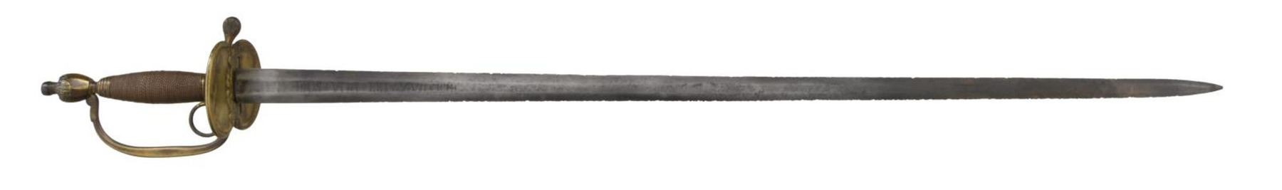 Sword measures 40 1/2" overall with a 33 3/4" blade. This interesting sword has the appearance of a British P1796 infantry sword. This example has an added finger ring inside the knuckle bow, and the blade appears to be from a Spanish 18th century rapier. The blade has 3 facets on each side and a short central 7 1/2" fuller with worn words that appear to read, “VII DIOS VIVA LEI YVII REI”. Gilded brass hilt with double kidney guard, the inside guard folds for comfortable wearing. Plain knuckle bow. Embellished urn-shaped pomme. Wire-wrapped grip. CONDITION: blade has a medium gray patina with some evidence of cleaned, light pitting. There are numerous nicks to the edge of the blade. The hilt is quite solid and retains traces of its original gilded finish. The folding guard functions well.(02-20027/BF). $400-600.