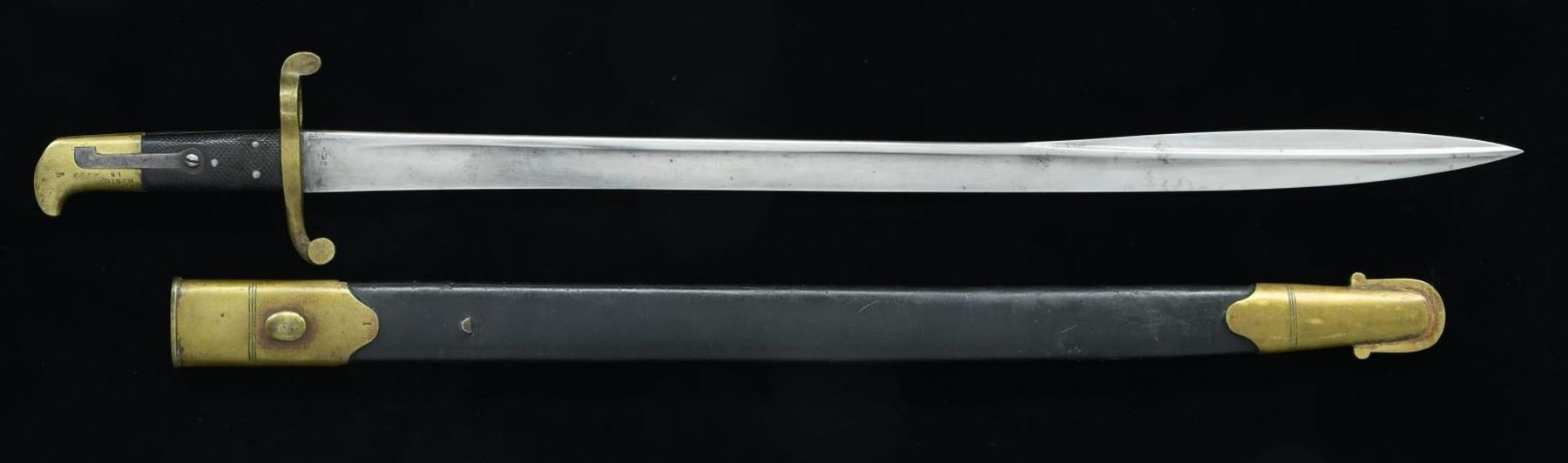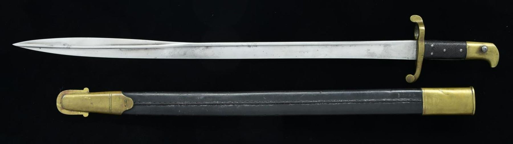 Overall length: 29 1/2". Blade length: 24”. Plain pipe-back blade with swelled tip. The ricasso is stamped “(crown) / DR / 21 / B / 78”. Brass crossguard & bird’s head style pommel stamped “5.D.V M.S.C 15” & “2230”. 2-Piece pressed leather grip. Brass mounted leather scabbard. CONDITION: blade has a light gray patina. Brass has a pleasing mustard patina. Grips show wear but are complete. Scabbard is quite solid with minimal wear. (02-20068/BF). $400-600.