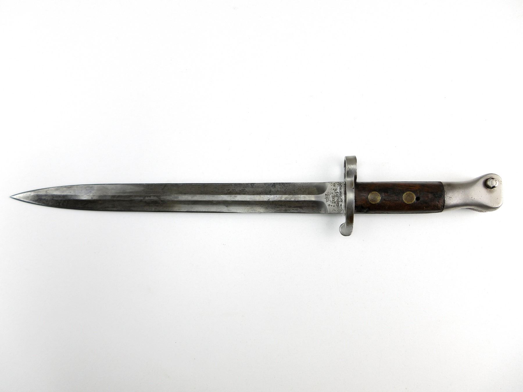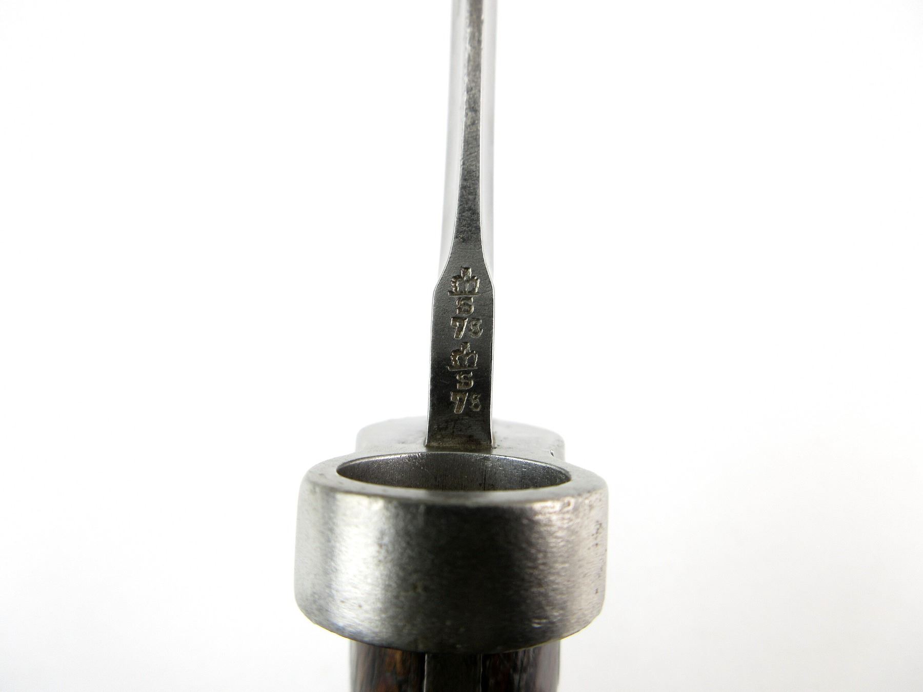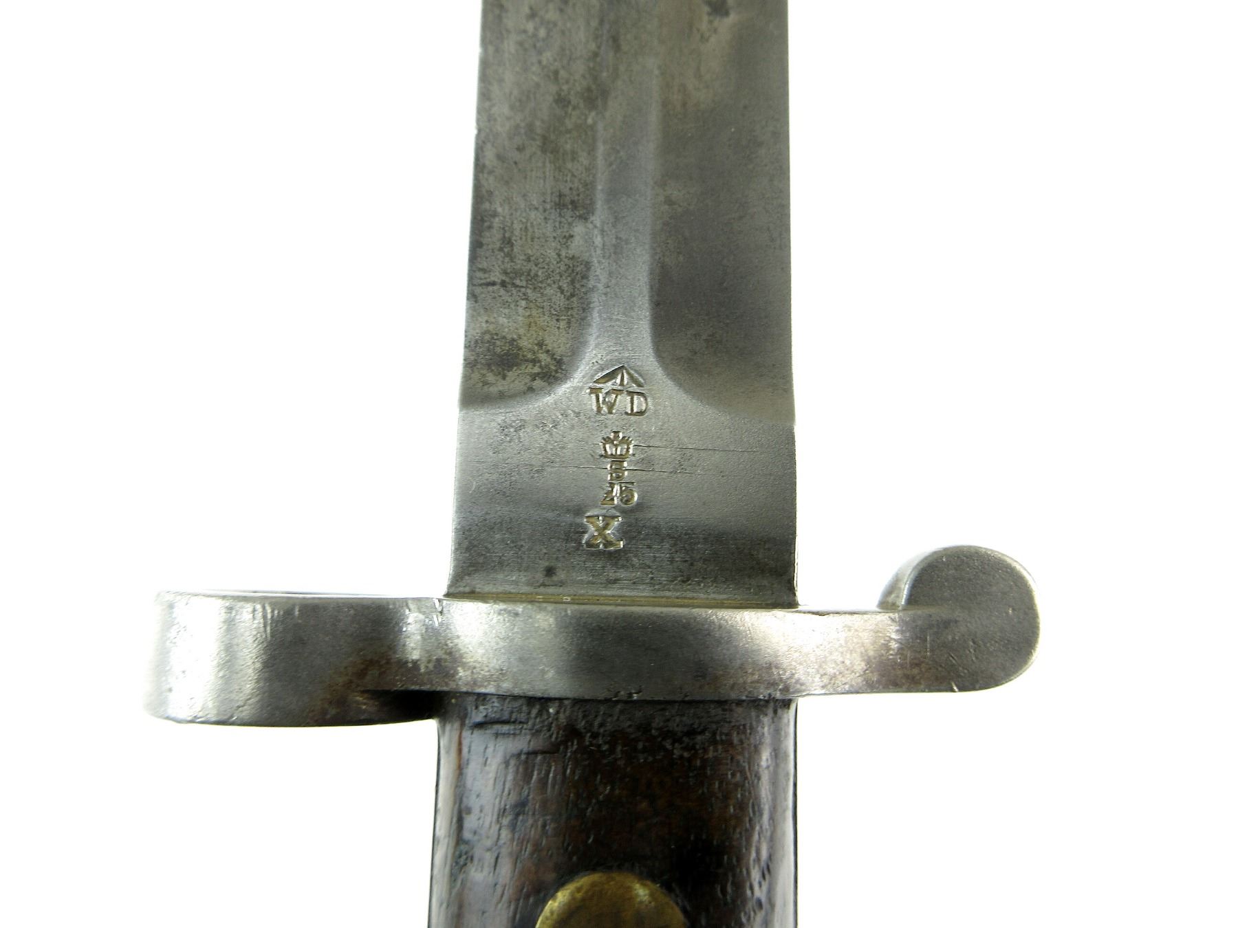 (1) FITS 1888 LEE METFORD & LONG LEE ENFIELD RIFLES, RICASSO MARKED: CROWN OVER "VR" OVER "10/94" OVER "SANDERSON.SHEFFIELD", VARIOUS REBUILD DATES STAMPED OVER TOP, OTHER-SIDE MARKED: BROAD ARROW OVER "WD" OVER CROWN OVER "S" OVER "25" OVER "X (BEND TEST)", SPINE OF BLADE DOUBLE-STAMPED: CROWN OVER "S" OVER "76", 2-PIECE WOOD GRIP, METAL POMMEL MARKED: "3D. R.G.A. (REGIMENT GARRISON ARTILLERY)" & "30", NO SCABBARD, BLADE APPROX. 12" & OAL APPROX. 16.75". SEE PHOTOS.