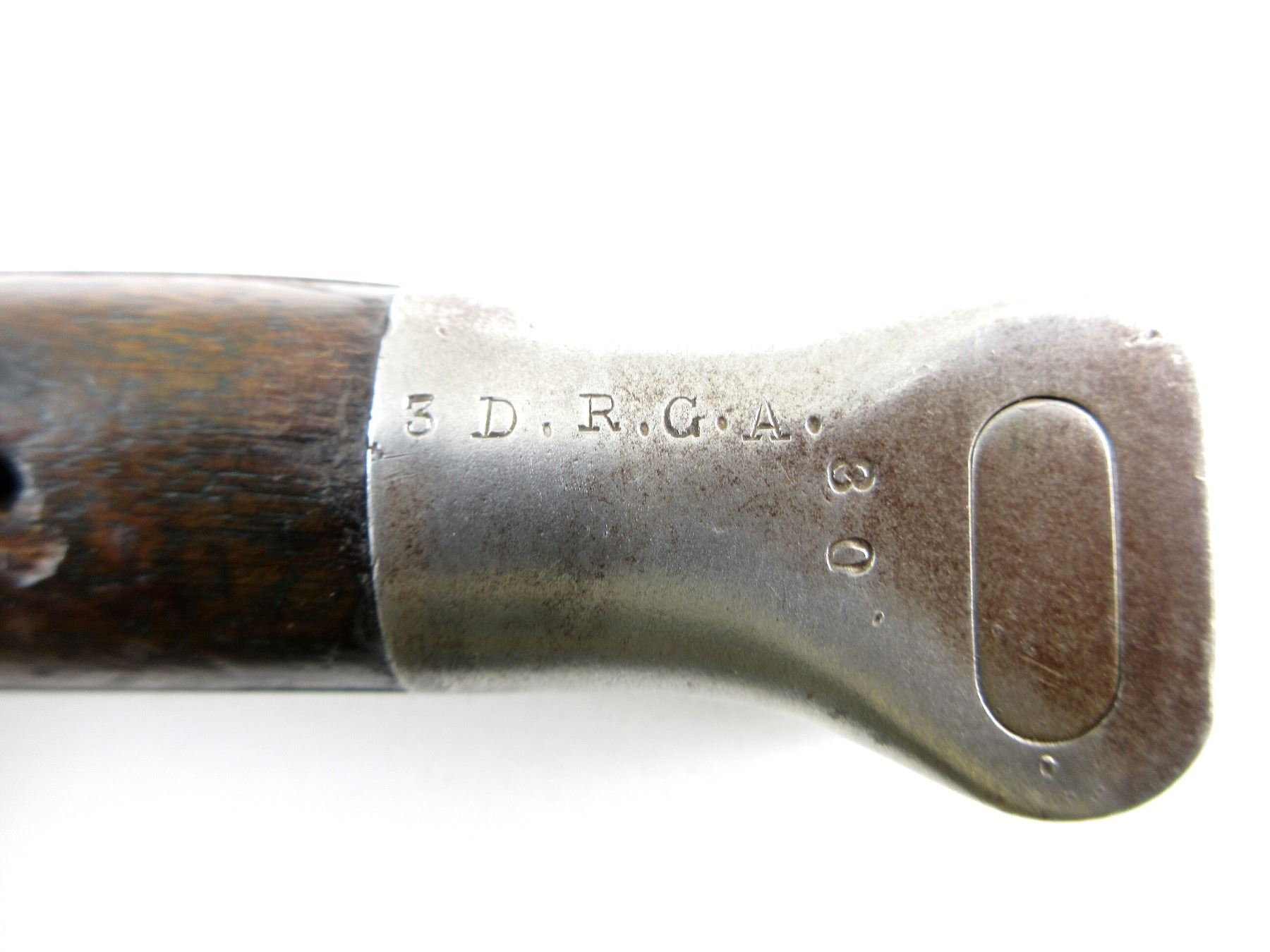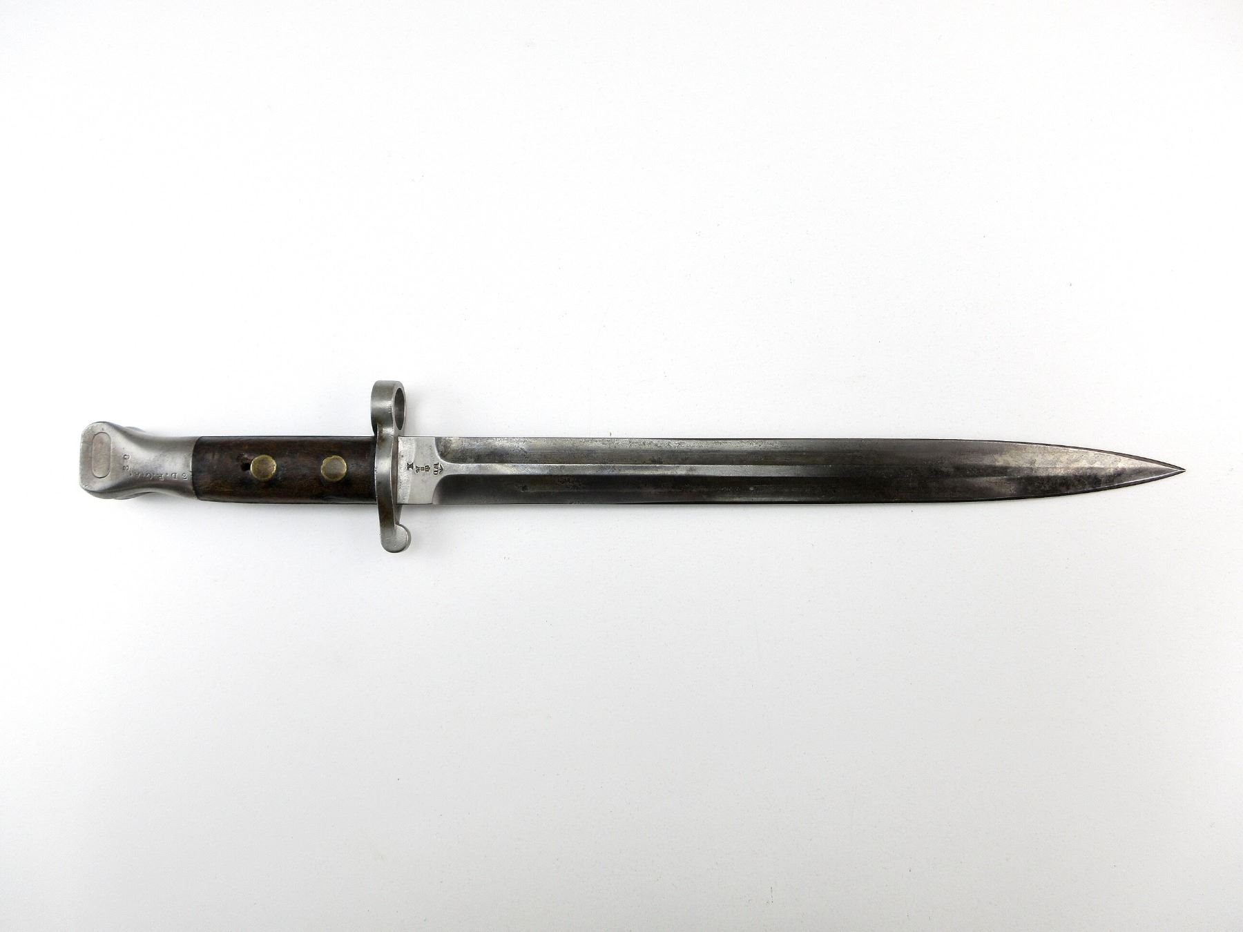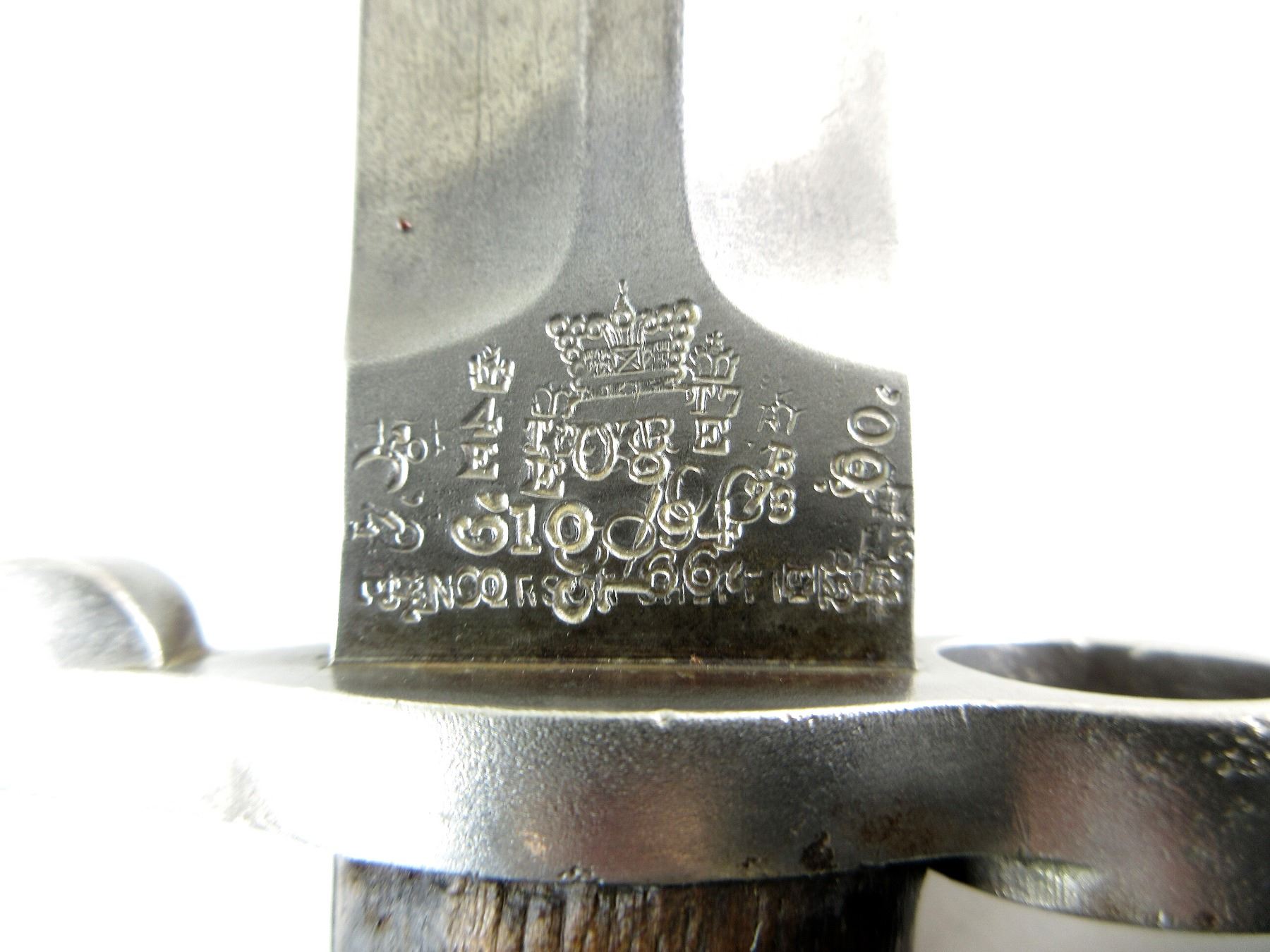 (1) FITS 1888 LEE METFORD & LONG LEE ENFIELD RIFLES, RICASSO MARKED: CROWN OVER "VR" OVER "10/94" OVER "SANDERSON.SHEFFIELD", VARIOUS REBUILD DATES STAMPED OVER TOP, OTHER-SIDE MARKED: BROAD ARROW OVER "WD" OVER CROWN OVER "S" OVER "25" OVER "X (BEND TEST)", SPINE OF BLADE DOUBLE-STAMPED: CROWN OVER "S" OVER "76", 2-PIECE WOOD GRIP, METAL POMMEL MARKED: "3D. R.G.A. (REGIMENT GARRISON ARTILLERY)" & "30", NO SCABBARD, BLADE APPROX. 12" & OAL APPROX. 16.75". SEE PHOTOS.