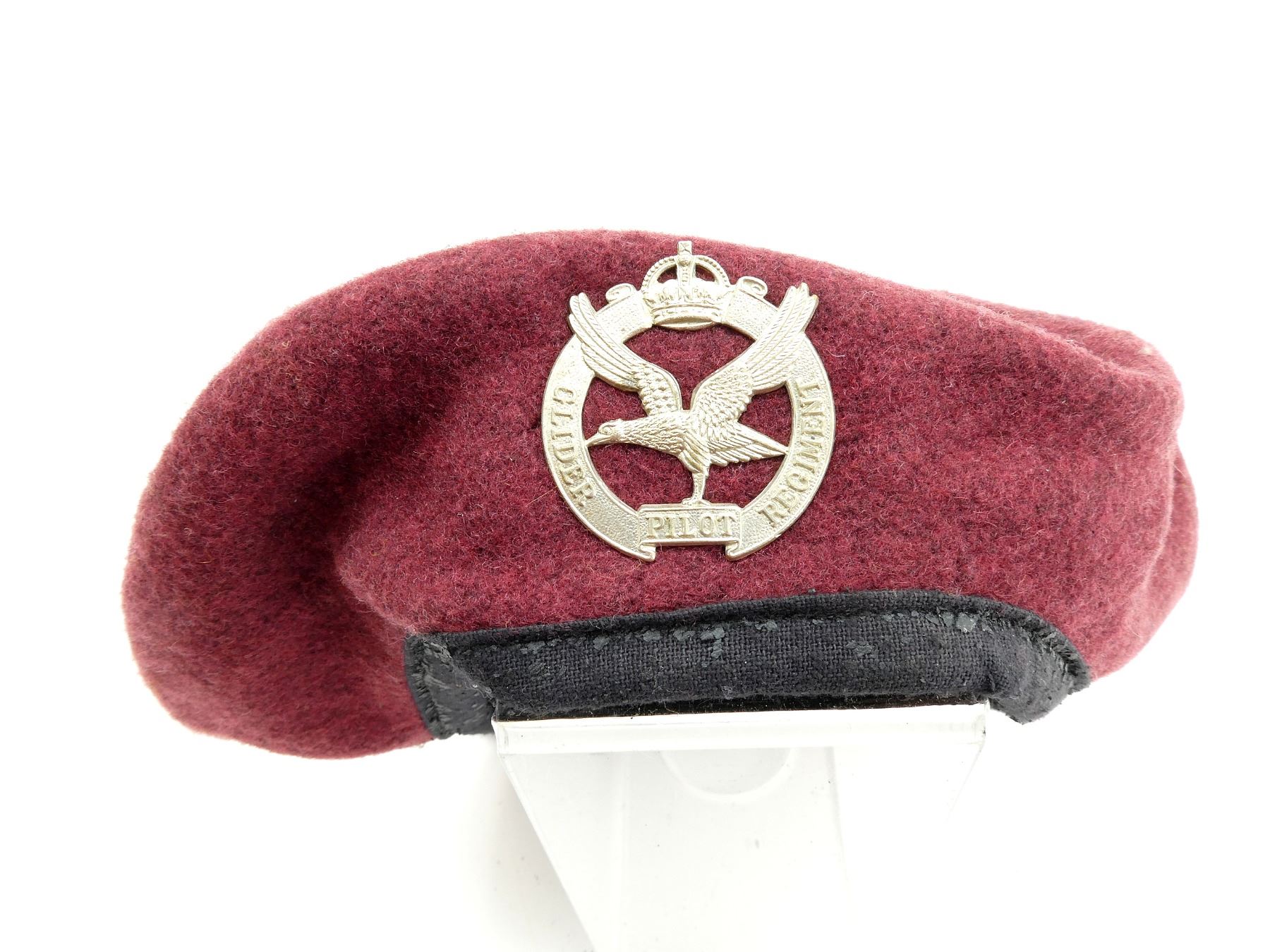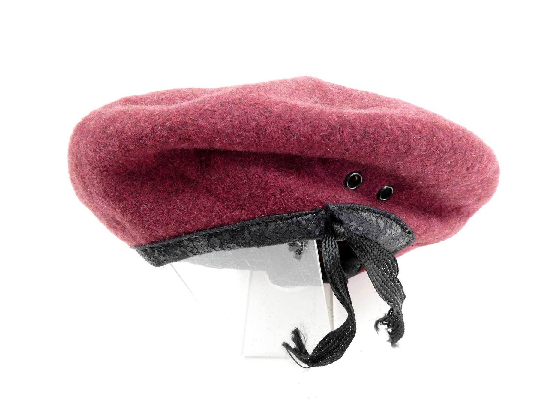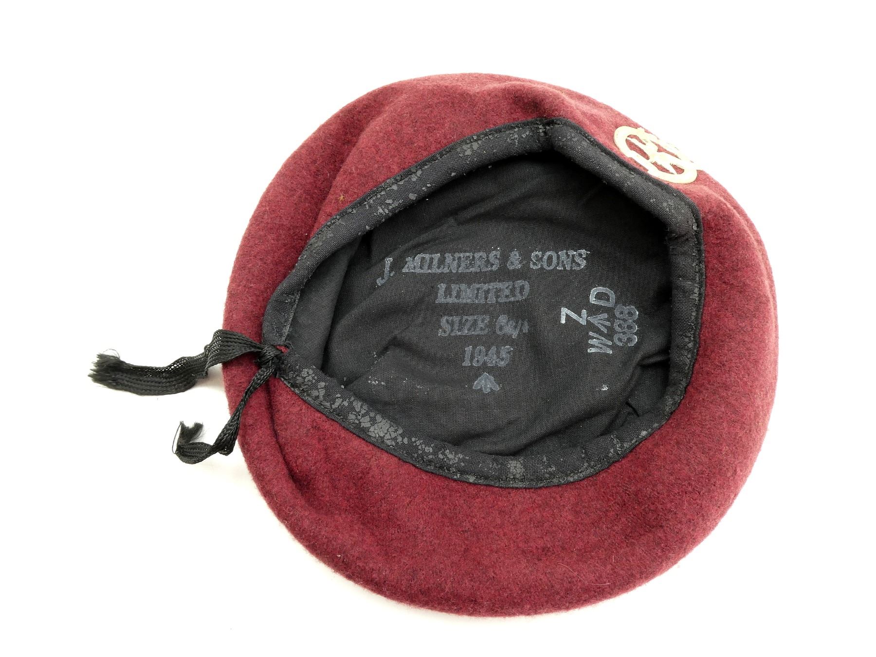 (1) WOOL MAROON BERET, MARKED: " J. MILNERS & SONS LIMITED, SIZE 6 3/4, 1945", GLIDER REGIMENT PILOT PIN, W.D BROAD ARROW MARK. SEE PHOTOS.