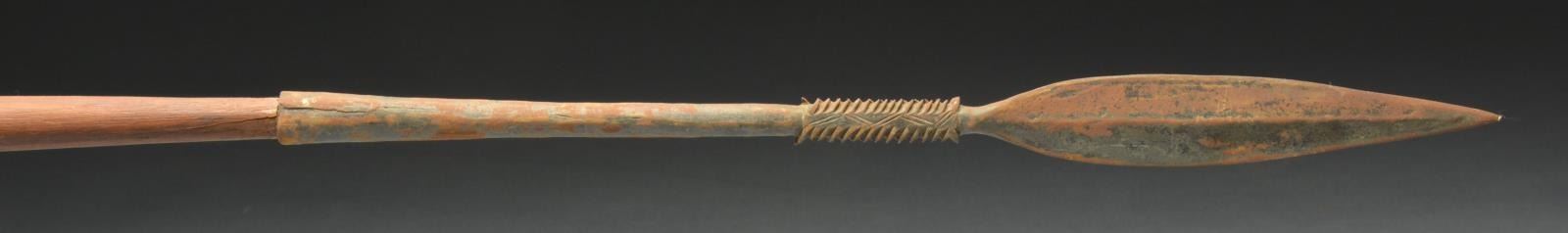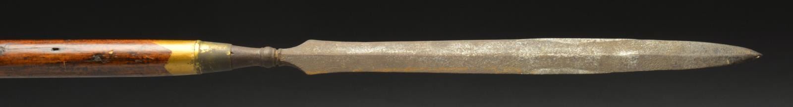 3) SPEAR. Overall length: 80 1/2" w/ a 15" head. The spear possibly originates from the African continent. The haft may be an early replacement but fits the head well & has a pleasing appearance. CONDITION: head has a dark iron finish mixed w/ areas of deep red oxidation. Haft is strong w/ minor scuffs & scrapes. (02-15428/BF). $700-1,000.