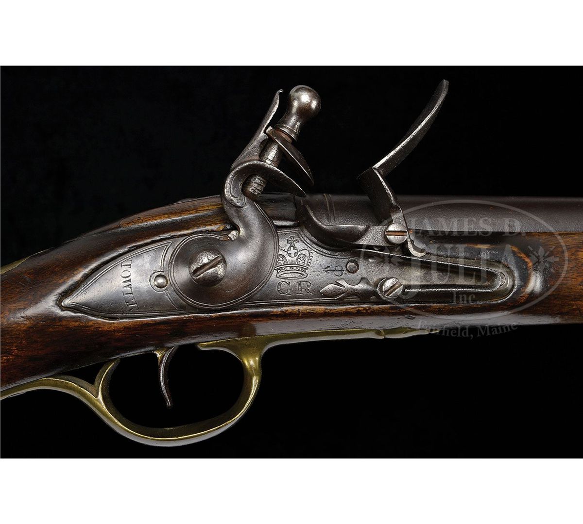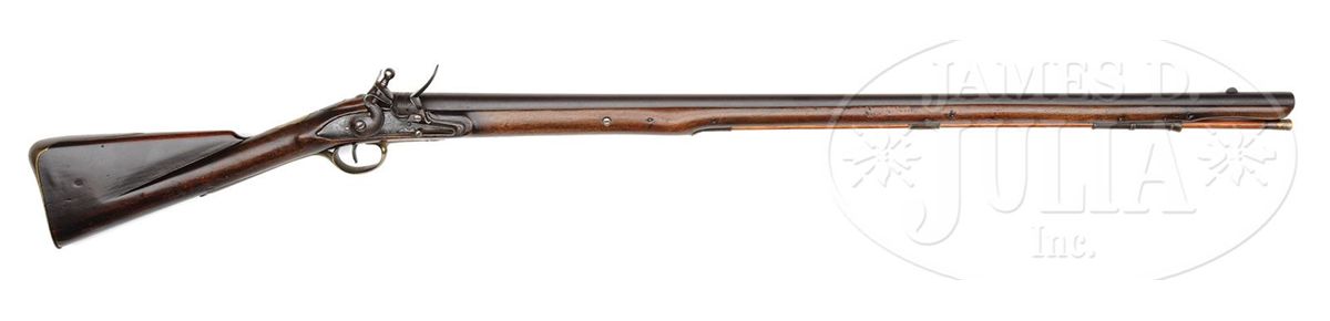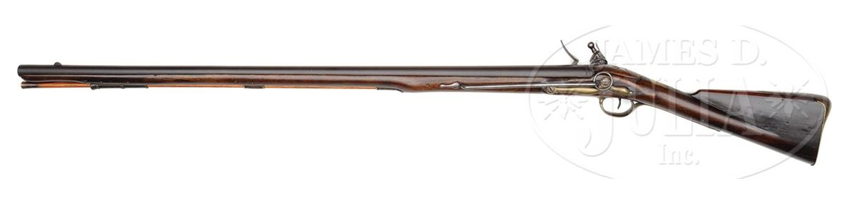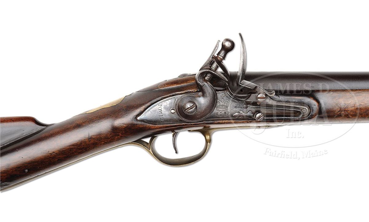 NSN. .72 Cal. X 37" long bbl marked near breech with "crown/GR/Broad Arrow" over crown/cross septres and front sight set back 2-1/2" from muzzle. 6-1/8" long lock marked under pan "Crown/GR" and Broad Arrow, behind the cock "TOWER" reading in vertical arc. Brass furniture consisting of 3 ramrod pipes, trigger guard, buttplate, escutcheon plate, and side plate are all of Long Land Pattern. Opposite the lock side is a 9-1/2" long steel sidebar with sling ring indicating Calvary use. European walnut stock is 52" long, stocked to the muzzle and is marked with the Ordnance Storekeepers mark right side of buttstock and a Crown number behind the trigger guard indicating made for British regular issue. Carbine retains what appears to be the orig brass tipped wooden rammer. PROVENANCE: See American Military Shoulder Arms, Volume 1, by Moller, pp. 264-265. Collection of Dr. Douglas Sirkin. CONDITION: Bbl and lock show a beautiful dark patina. All the brass furniture matches showing even pattern of staining. Walnut stock is in excellent condition with only minor handling marks, a possible forend crack repair 8" long on left side and minor wood erosion around bbl and furniture pins consistent with a gun dating from the period of the American Revolution. 4-50058 PAS8