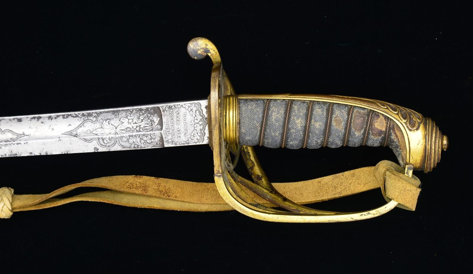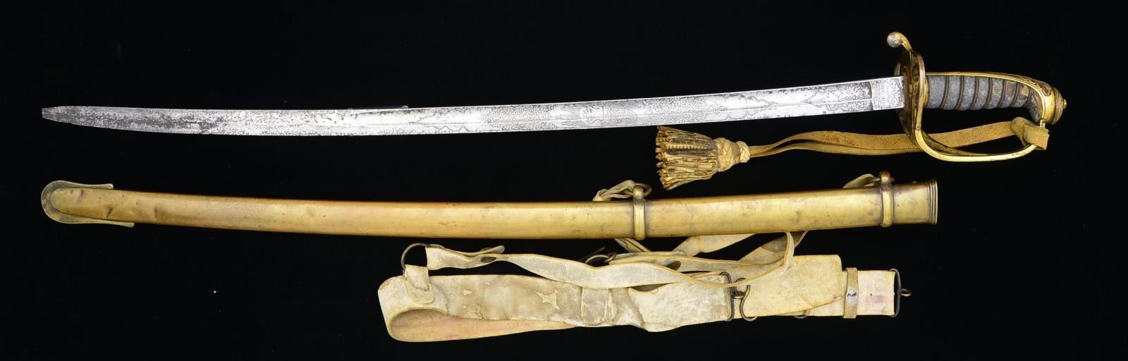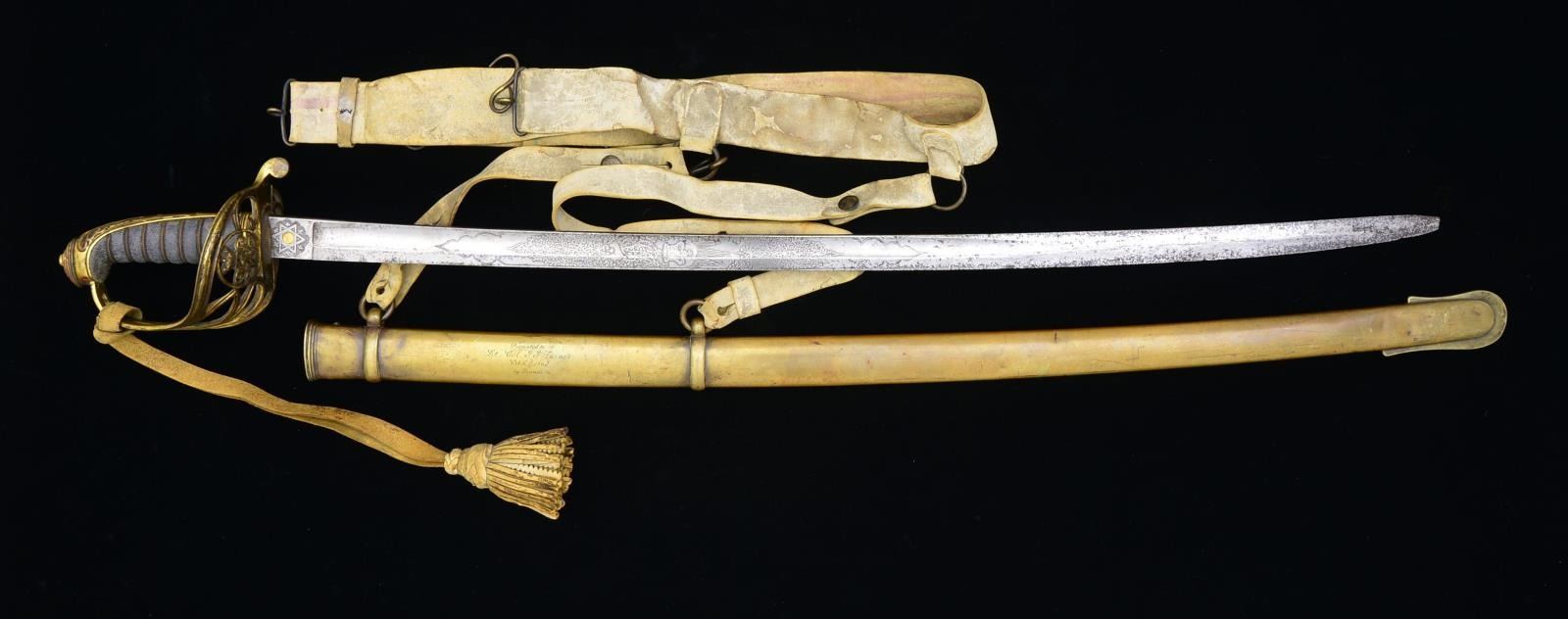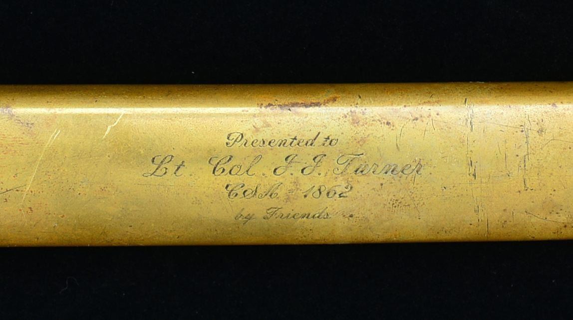 PRESENTED TO LT. COL. J.J. TURNER OF THE CONFEDERATE STATES OF AMERICA. Overall length: 39 3/4". Blade length: 32”. A fine example of a standard British P1845 infantry officer’s saber w/ brass scabbard, white buff knot & white buff belt. Single fullered blade has a slightly raised medial ridge below the fuller. Blade is etched over the first half of the blade w/ foliate motifs along w/ a crowned “VR”. Blade is etched at the ricasso, “HENRY WILKINSON PALL MALL LONDON”. Gilded brass hilt featuring a pierced guard w/ a crowned “VR”. Inside guard folds down to facilitate wearing close to the body. Wire wrapped sharkskin grip. Lg. white buff sword knot. Brass scabbard is engraved between the mounts, “Presented to Lt. Col. J. J. Turner C S A 1862 by Friends”. We were able to find a Lt. Col. J.J. Turner commanding the Tenth & Thirtieth Tennessee Infantry. There is a white buff belt attached w/ original saber hangers. Buckle would have originally been a snake type example but the snake has been lost & replaced w/ a plain S type hook. A very interesting & possibly intensely historic sword worthy of time & research. CONDITION: blade has a medium gray cleaned finish w/ areas of cleaned pitting particularly near the tip. The extreme tip of the sword is missing. Etching is quite clear. Hilt retains 70% of original gilded finish. Knot is worn but quite solid. Scabbard has a few superficial shallow dents but no notable damage. Engraved presentation is clear. Belt & hangers are reasonably pliable & remain quite solid. (02-14196/BF). $2,000-3,000.