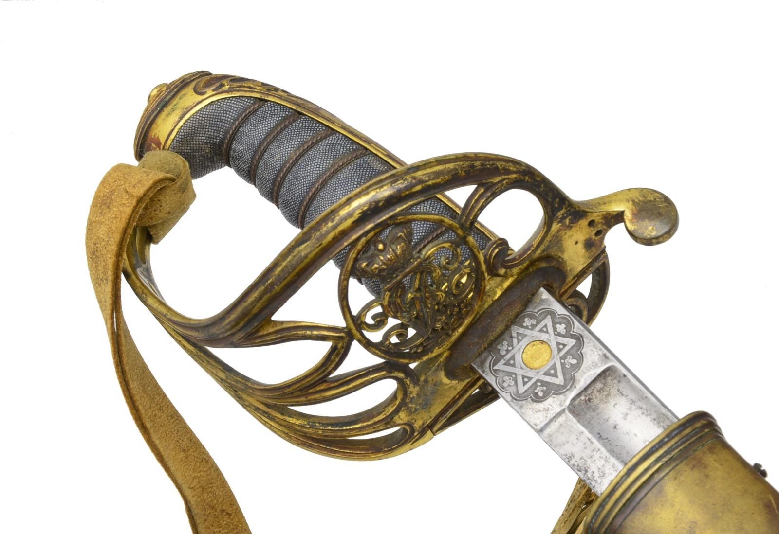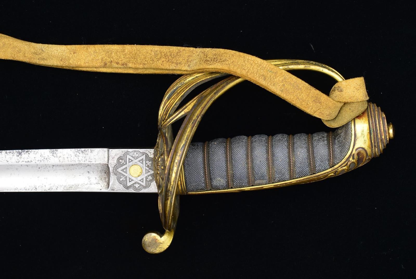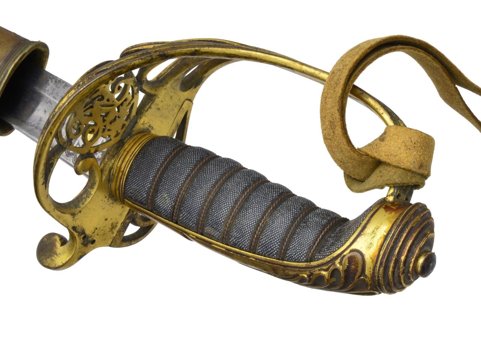 PRESENTED TO LT. COL. J.J. TURNER OF THE CONFEDERATE STATES OF AMERICA. Overall length: 39 3/4". Blade length: 32”. A fine example of a standard British P1845 infantry officer’s saber w/ brass scabbard, white buff knot & white buff belt. Single fullered blade has a slightly raised medial ridge below the fuller. Blade is etched over the first half of the blade w/ foliate motifs along w/ a crowned “VR”. Blade is etched at the ricasso, “HENRY WILKINSON PALL MALL LONDON”. Gilded brass hilt featuring a pierced guard w/ a crowned “VR”. Inside guard folds down to facilitate wearing close to the body. Wire wrapped sharkskin grip. Lg. white buff sword knot. Brass scabbard is engraved between the mounts, “Presented to Lt. Col. J. J. Turner C S A 1862 by Friends”. We were able to find a Lt. Col. J.J. Turner commanding the Tenth & Thirtieth Tennessee Infantry. There is a white buff belt attached w/ original saber hangers. Buckle would have originally been a snake type example but the snake has been lost & replaced w/ a plain S type hook. A very interesting & possibly intensely historic sword worthy of time & research. CONDITION: blade has a medium gray cleaned finish w/ areas of cleaned pitting particularly near the tip. The extreme tip of the sword is missing. Etching is quite clear. Hilt retains 70% of original gilded finish. Knot is worn but quite solid. Scabbard has a few superficial shallow dents but no notable damage. Engraved presentation is clear. Belt & hangers are reasonably pliable & remain quite solid. (02-14196/BF). $2,000-3,000.