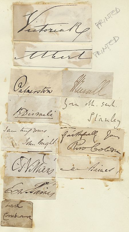 A lot of ten signatures on small slips, mounted to a single album page. Includes: HENRY JOHN PALMERSTON, BENJAMIN DISRAELI, JOHN BRIGHT, FREDERIC VILLIERS, ARTHUR STANLEY, EDWARD BAINES and others. Also affixed to the sheet are printed signatures of Victoria and Albwer. Gluestains and light toning to some examples, good condition.