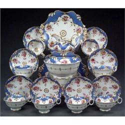 A John Ridgway part tea and coffee service, painted with flower sprays within a shaped blue and gilt border, comprising six tea cups, four coffee cups, ten saucers, cream jug, bowl and two cake plates, pattern 2/6913, printed mark in puce, c.1830 (24)