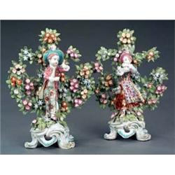 BRITISH PORCELAIN - A pair of Bow New Dancer figures A pair of Bow New Dancer figures, both wearing broad brimmed feathered hats and brightly coloured floral costumes, standing before flowering trees applied with coloured flowers in iron-red, blue, yellow and green, standing on a four footed scroll moulded base enriched with turquoise and gilt, c.1755 (some faults)