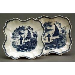 BRITISH PORCELAIN - A pair of Caughley shaped square dishes, printed with Fisherman pattern in b...