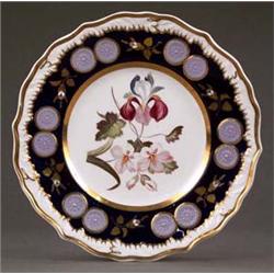 BRITISH PORCELAIN - A pair of English porcelain shaped circular cabinet plates A pair of English porcelain shaped circular cabinet plates, the fields painted with botanical studies within deep cobalt blue borders decorated in gilt with rosebuds and moulded lobed roundels, acanthus leaf border, gilt rims, 8.75in diam, c.1860
