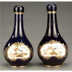A pair of bottle shaped vases and covers, painted with exotic birds within raised gilt scrolling foliage border on a royal blue ground