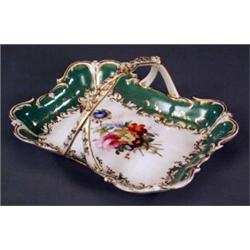 A waisted oblong basket, with gilt entwined handle, painted with flower spray and with apple green and gilt border, 10.25in wide