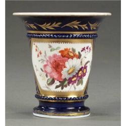 An English tapering vase, with moulded beaded bands, painted with panels of flowers within gilt borders on a royal blue ground, 3.75in high
