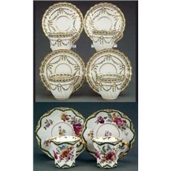Four Copelands coffee cups and saucers, spirally fluted and painted with festoons in green, and rosettes and bands in gilt; two Dresden coffee cups and saucers, painted with flowers and waved apple green borders (8)