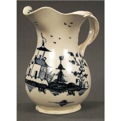 A Leeds creamware baluster jug, the double entwined handle with blue floret and leaf terminals and painted with Chinese scene with house in blue, 5in high (chips to base)
