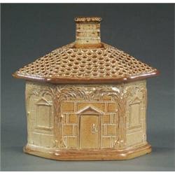A saltglazed stoneware caddy and cover, in the form of a hexagonal cottage, 5.5in high (2)